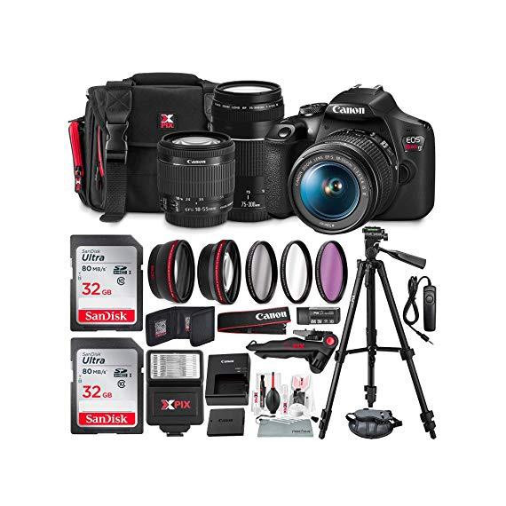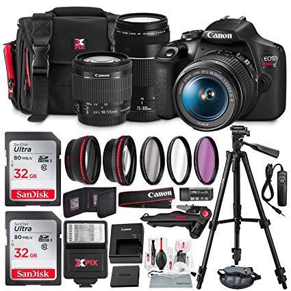 Canon T7 EOS Rebel DSLR Camera with 18-55mm and 75-300mm Lenses Kit + UV Filter Set + Tripods + Flash & 32GB Dual SD Card Accessory Bundle