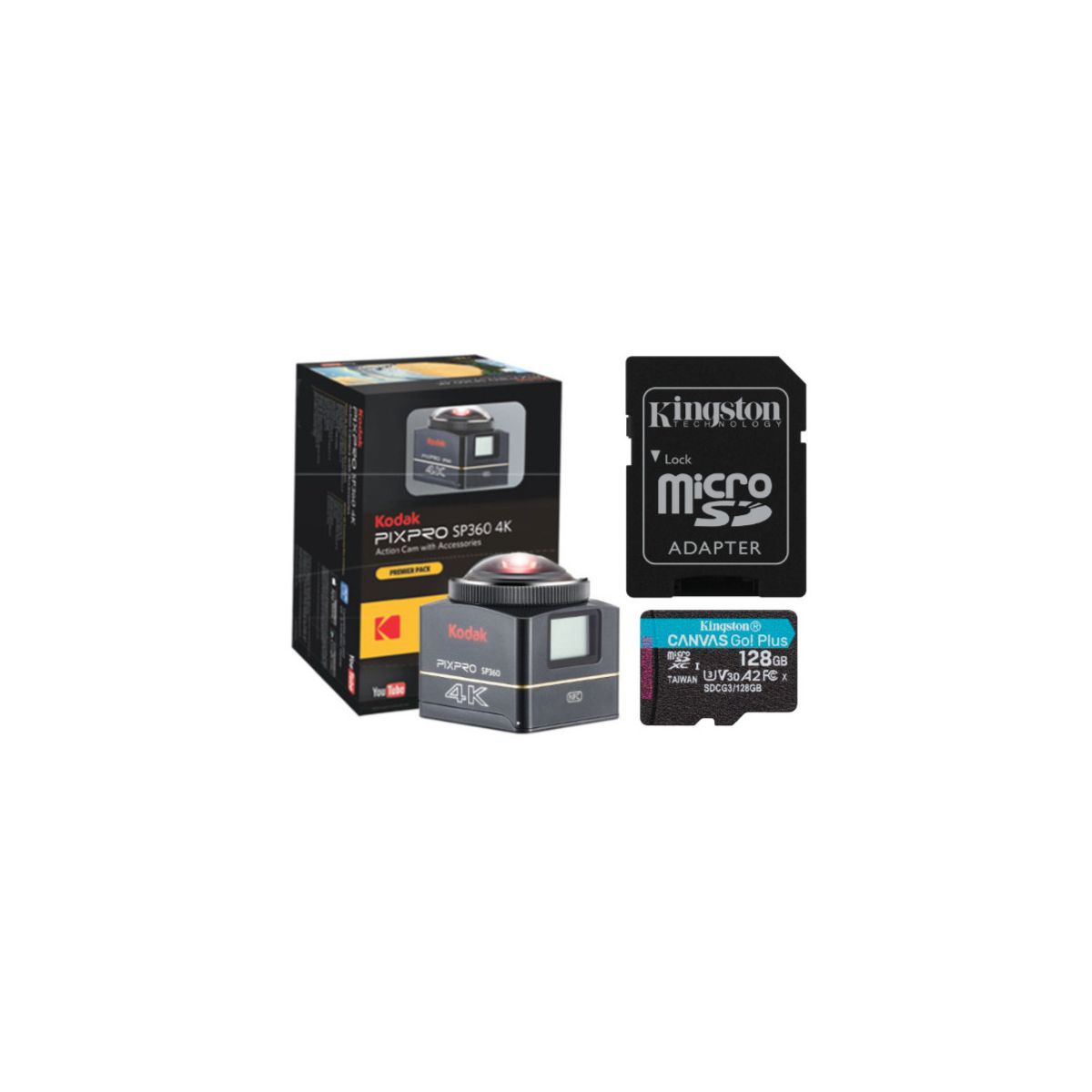 Kodak PIXPRO SP360 4K - VR Camera Premier PackThe Kodak PIXPRO SP360 4K Action Camera Premier Pack is designed to make your 360-degree experience smooth and easy. Prepare to marvel at the seamless amount of detail, clarity and precision this compact VR Camera provides, which easily fits in the palm of your hand. Add the flexibility of our complimentary editing software and you’ve only scratched the surface of what this portable VR Camera can do. Kodak PIXPRO Digital Cameras – Tell your story.Kingston 128GB MicroSDXC Canvas Go Plus Memory CardKingston 128GB MicroSDXC Canvas Go Plus microSD is for adventurers who are always on the go chasing the perfect moment to capture. With superior transfer speeds of up to 170MB/s, the Canvas Go! Plus microSD card accelerates your workflow and efficiency so that you’ll have more time to take your creativity onto the next adventure.Seamless and ConsistentWith U3 and V30 speed performance, shoot stunning 4K Ultra-HD videos without worrying about slow speeds and dropped frames, or shoot fast-action photos that are seamless and consistent.Expedite Your WorkflowThe Canvas Go! Plus microSD supports A2 Application Performance Class to expedite your workflow with faster application performance on smartphones and tablets.Optional SD AdapterAn optional SD adapter provides added versatility for use with SD-compatible devices. View the world as your canvas and take your creativity and inspiration on the road with the Canvas Go! Plus microSD. Perfect for capturing every moment..