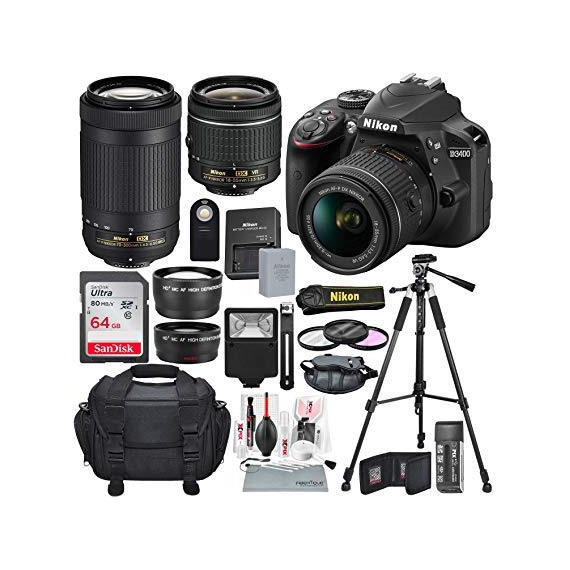 Make sure this fits by entering your model number. Bundle Includes - Nikon D3400 24.2MP DSLR Camera w/ 18-55 and 70-300 lens / 64GB Memory Card / Telephoto Lens / Wide Angle Lens / 3-Piece Filter Kit / Digital Slave Flash / Wireless Shutter Release / 58" Tripod / DSLR Accessories Bundle with Bag Nikon Authorized Dealer - Includes USA Manufacturer's Warranty 24.2MP DX-Format CMOS Sensor / EXPEED 4 Image Processor / No Optical Low-Pass Filter Native ISO 100-25600; 5 fps Shooting / 3.0" 921k-Dot LCD Monitor / Full HD 1080p Video Recording at 60 fps Multi-CAM 1000 11-Point AF System / SnapBridge Bluetooth Connectivity / AF-P DX 18-55mm f/3.5-5.6G VR Lens / AF-P DX 70-300mm f/4.5-6.3G ED Lens