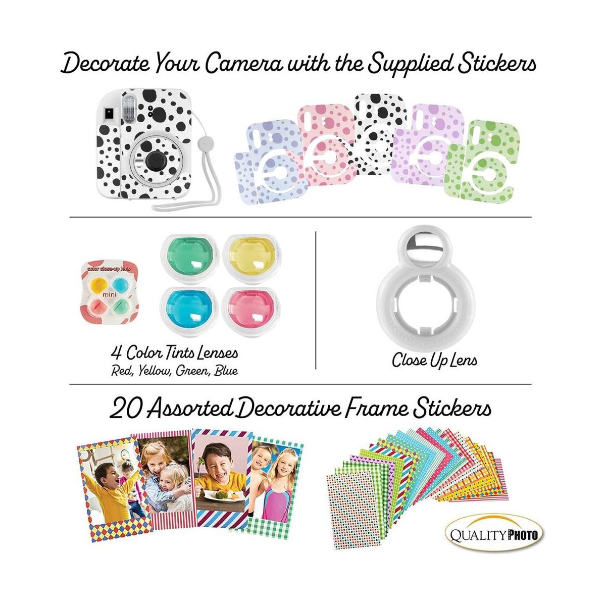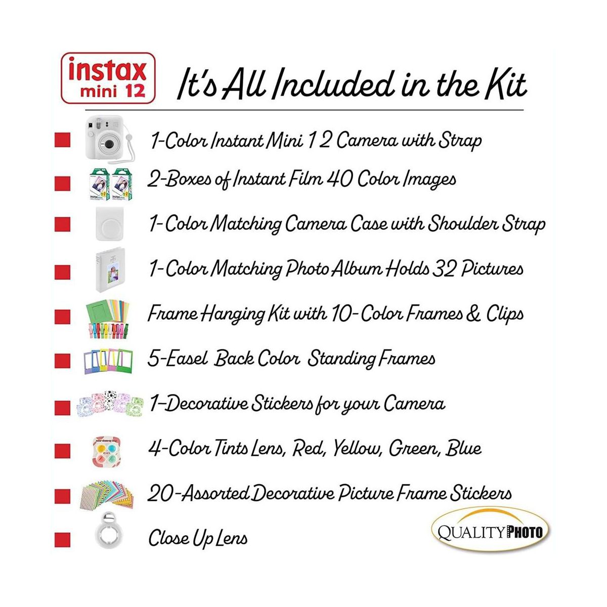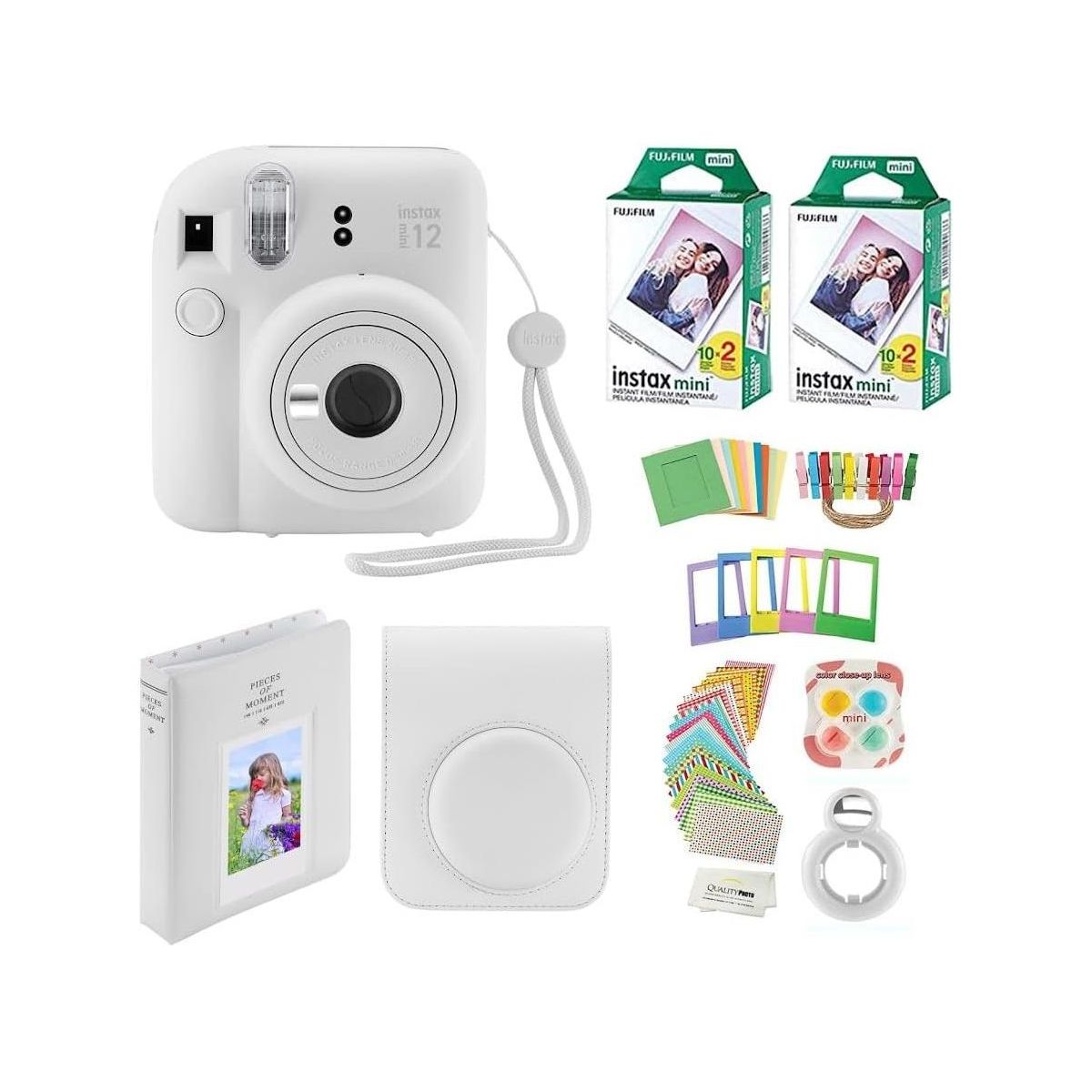 Value accessory bundle. Includes the famous Fujifilm Instax Mini 12 Camera (color your choice) with a matching Camera Case to keep the camera protected. 40 Fujifilm Instax Films so you can use your brand new camera right away! Photo Album, perfectly sized for the instant prints. Many more accessories including frames to hang and decorate you photos, stickers, close up color lenses, and camera sticker for added color. The newly updated Fujifilm instax Mini Camera 12 features a slim body with newest design. Parties, birthdays anniversaries, carnivals or gifts... all are times to use the Fujifilm Instax Camera, You will not regret the Mini 12 buy. The most valued gift bundle for the best price!