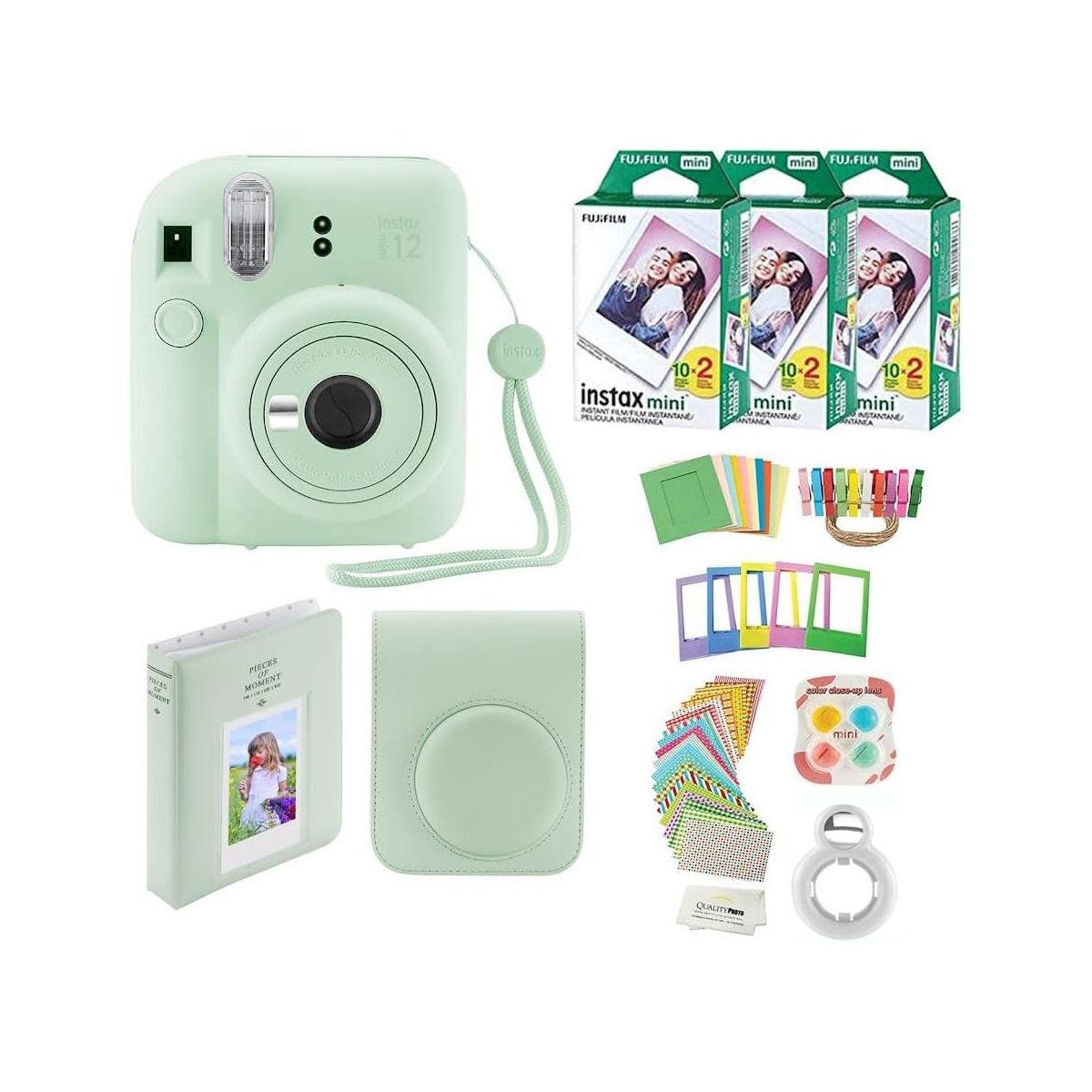Value accessory bundle. Includes the famous Fujifilm Instax Mini 12Camera (color your choice) with a matching Camera Case to keep the camera protected. 60 Fujifilm Instax Films so you can use your brand new camera right away! Photo Album, perfectly sized for the instant prints. Many more accessories including frames to hang and decorate you photos, stickers, close up color lenses, and camera sticker for added color. The newly updated Fujifilm instax Mini Camera 12 features a slim body with newest design. Parties, birthdays anniversaries, carnivals or gifts... all are times to use the Fujifilm Instax Camera, You will not regret the Mini 12 buy. The most valued gift bundle for the best price!