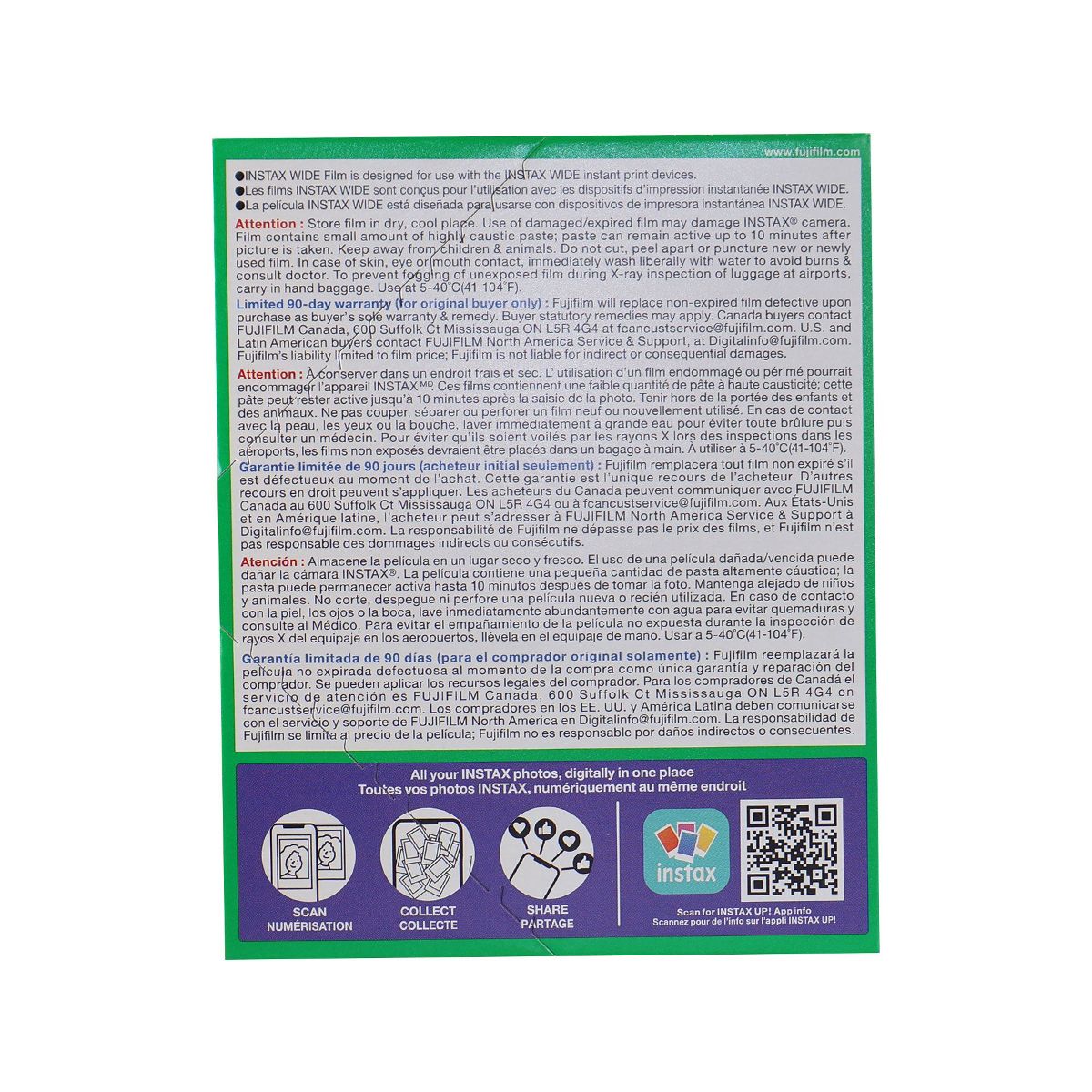 This twin pack of FUJIFILM INSTAX Wide Instant Film contains 20 sheets of instant color film that is compatible for use with the FUJIFILM INSTAX Wide series of cameras. This film features vivid color reproduction with natural skin tones when used under daylight (5500K) or electronic flash lighting conditions. A refined grain structure provides high image sharpness and clarity as well as a versatile ISO 800 film speed for use with a wide variety of subjects. Each sheet of film produces a 2.4 x 3.9" glossy image area that is surrounded by a simple white border.