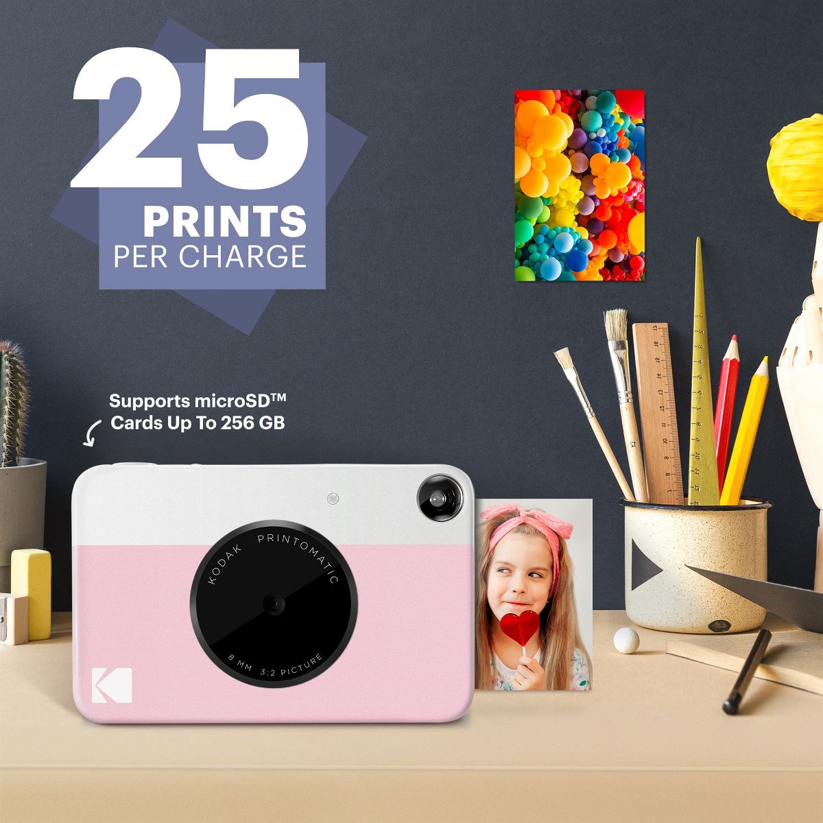 The Kodak Printomatic Mini Instant Camera prints smudge-proof, water- and tear-resistant photos up to 5 MP automatically. With this Kodak instant camera, you just point, shoot, and print. Perfect for taking on the go, whenever you want to share prints, the Kodak Printomatic Wireless Mini Instant Camera is the easiest way to share photos with friends. This mini digital camera's compact design slips neatly into your shirt pocket. The portable camera speed even allows you to continue shooting while your photo is printing. The "Insta Camera" Zero Ink technology means you don't need to worry about messy print cartridges, film, or toner. With this instant picture camera your prints are adhesive-backed, so you can get creative and use the photos to decorate, just as you would any sticker. Forget cumbersome printers just point and shoot the instant photo camera with you everywhere.