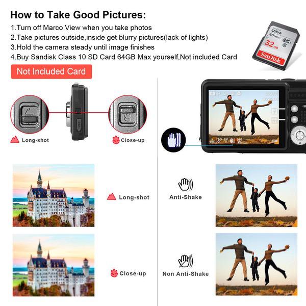 Make sure this fits by entering your model number. HD Mini Digital Camera-- 2.7" TFT LCD display with 8x digital zoom,Built in flash;18MP resolution for good photos&720P resolution for better video recording. Shooting Modes&Scenes-- Anti-shake,Face detection,Smile capture,Selfie Timer,Continue Shot;Auto/Night Portrait/Night Scenery/Portrait/Scenery/Beach/High sensitivity Birthday&Christmas Gift-- It's a great choice for traveling,daily use also very popular for Birthday,Christmas,Thanksgiving Days Gift.Recording beautiful moment for you and your family Using Message-- Buy Class 10 SD/SDHC Card 32GB Max(over 80MB/S,no cards)for better using.Please update your computer USB Driver if picture upload failed,Or use a sd/sdhc card reader.Use camera on a full light environment never in dark,Turn off Marco Mode always! Warrenty Message--If your camera takes unclear pictures,or battery does not hold a charge overnight,or even picture transfers failed.Please do not hesitate to Email us directly,We Offer 30 Days Satisfication Money Back and One Year Warranty