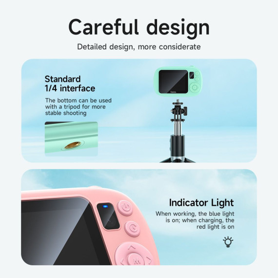 Designed for curious minds, the hoco Kids Dual-Cam Digital Camera makes it easy and fun for children to explore their world through photography. Crafted from safe, durable materials, it features a 2.0-inch HD screen and captures both HD video and still photos. Its lightweight, portable design encourages on-the-go creativity, while included accessories add a personal touch to every adventure.