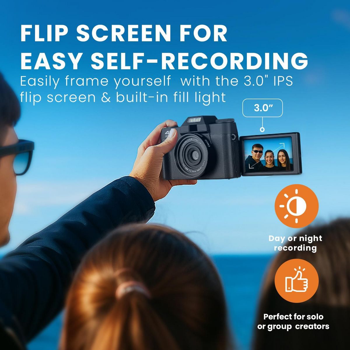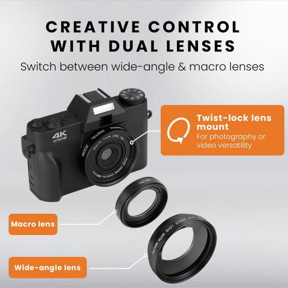 Capture your world in stunning detail with the HOM 4K Digital Camera. Record ultra-HD video at 30FPS and enjoy the flexibility of interchangeable wide-angle and macro lenses—perfect for everything from travel vlogs to creative photography. The 3.0" flip screen and built-in fill light make self-recording easy, while 16x digital zoom and autofocus ensure every shot is sharp. Built-in Wi-Fi lets you control the camera remotely or transfer files on the go, and with a 32GB micro SD card included (supports up to 256GB), you're ready to shoot right out of the box.