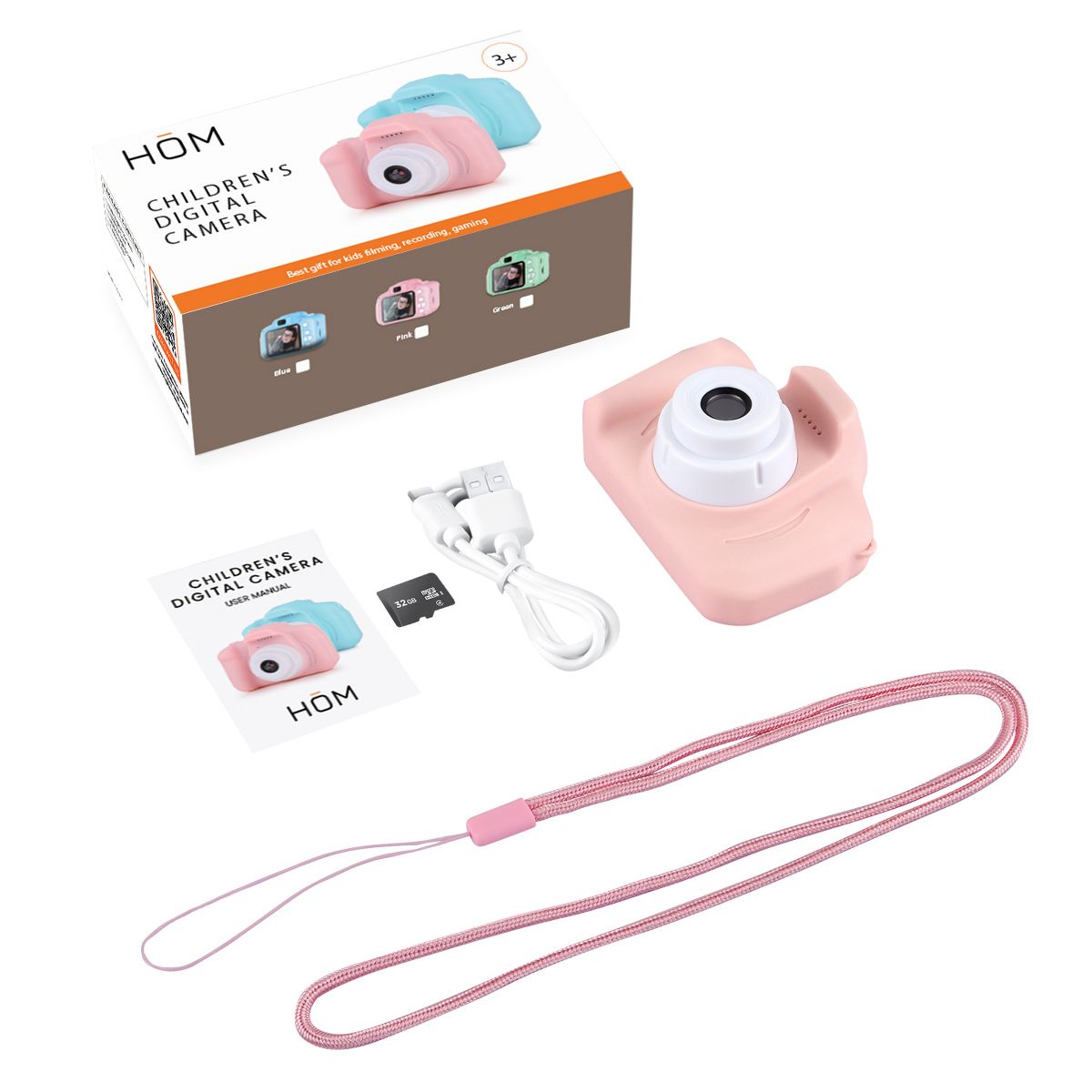 The HOM Kids Camera's vibrant and durable design, complete with eye-catching colors, is perfect for boys and girls who love capturing adventures in style. Safety is paramount with the included hand strap, providing a secure grip for small hands and a worry-free photography experience for kids and parents alike.