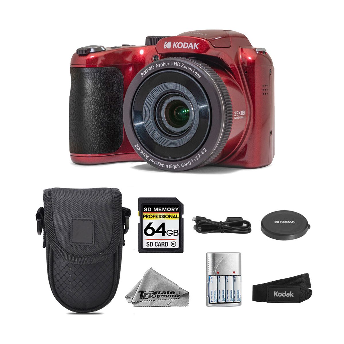 Kodak PIXPRO AZ255 Digital Camera (Red) + Battery + Case + 64GB Kit
