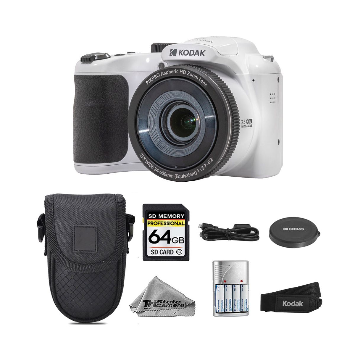 Kodak PIXPRO AZ255 Digital Camera (White) + Battery + Case + 64GB Kit