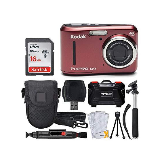 Kodak PIXPRO FZ43 Digital Camera (Red) + 16GB Memory Card + Deluxe Point and Shoot Camera Case + Extendable Monopod + Lens Cleaning Pen + LCD Screen Protectors + Table Top Tripod – Top Valued Bundle