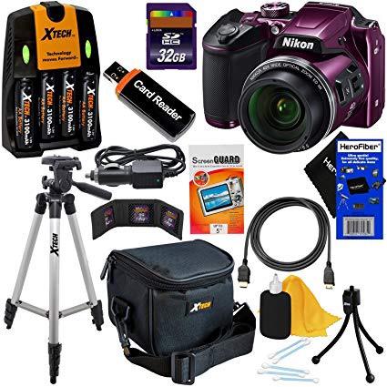 Nikon COOLPIX B500 Wi-Fi, NFC Digital Camera w/40x Zoom & HD Video (Plum) - International Version (No Warranty) + 4 AA Batteries with Charger + 10pc 32GB Dlx Accessory Kit w/ HeroFiber Cleaning Cloth