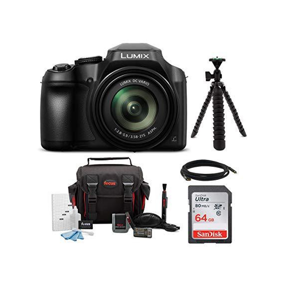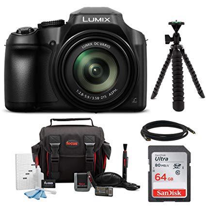 Make sure this fits by entering your model number. Bundle Includes - Panasonic LUMIX FZ80 4K Long Zoom Camera / SanDisk Ultra 64GB SD Card / 12-Inch Spider Tripod / Focus DSLR Holster Bag / Mini HDMI Cable Panasonic Authorized Dealer - Includes USA Manufacturer's Warranty FEATURES: Extremely Long Zoom and Wide Angle for Versatile Photography / 4K PHOTO Mode Plus 4K Video Capture for High Resolution Stills and Movies SENSOR: 18.1MP Sensor Resolution with optically Stabilized 20-1200mm (60X) LUMIX DC VARIO Lens and Power O.I.S. Technology. More Focus Freedom and Creativity with Post Focus and Focus Stacking POWER AND CONNECTIONS: USB Charging for Travel Use. WiFi Connectivity so you can share Photos to Mobile Device. Features a clear viewfinder and comfortable grip