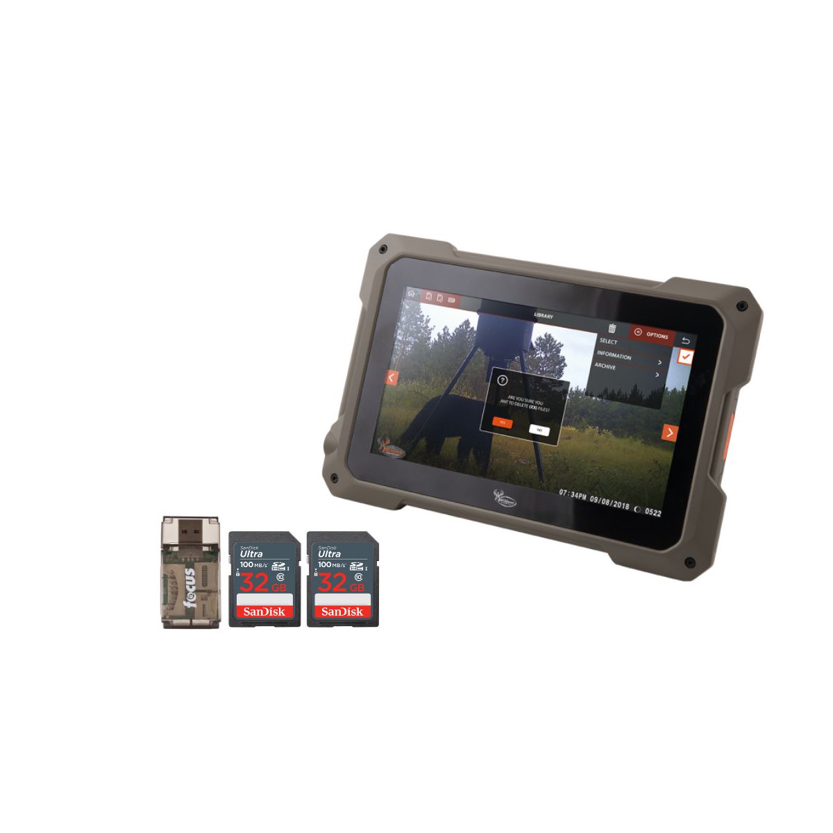 Wildgame Innovation 7-Inch HD Backlit TFT Touchscreen, Weather-Resistant Compact Trail Pad TabletThe compact and lightweight Wildgame Innovation Trail Pad Tablet looks and performs like a tablet, with HD images and videos filling the oversized 7 inches touch screen. But this isn’t just any other tablet. It’s a hunter’s tablet specifically designed to cater to all your game-tracking needs.Weather Resistant and SD Card PortsThe weather-resistant tablet features dual, standard-size SD card ports to sift through the hundreds of images and videos that every hunting season brings.Easy to UseInsert an SD card from your favorite trail cam into the library port to view every deer, hog, and turkey in HD quality. When you like what you see, send it over to the archive.Store the BestThis tablet stores the best of the best on a second SD card, so you can easily keep tabs on a single animal or the entire herd. No more endless scrolling to find that one picture you want to show your buddy.SanDisk 32GB Ultra SDHC UHS-I Memory Card (100MB/s)The SanDisk 32GB Ultra SDHC UHS-I Memory Card allows you to capture better pictures and Full HD videos with your compact to mid-range point and shoot cameras. Store tons of photos and videos, with speeds up to 100MB/s to quickly transfer it all to your computer.Capture the MomentThis SanDisk Ultra SD card delivers exceptional photo and video shooting performance to let you capture your memories when they happen.Picture and VideoCapture amazing quality pictures and Full HD video with your compact point-and-shoot camera.Keep ShootingShoot tons of photos and hours of Full HD video (1080p) without changing the card.DurableThis SanDisk Ultra SD card is durable and tested to protect your memories from life’s mishaps—waterproof, shockproof, x-ray proof, and temperature-proof.Focus? All-In-One High Speed Card ReaderTransfer data to and from your PC with this All-In-One High-Speed USB 2.0 Card Reader by Focus Camera. The high-speed memory card reader provides a transfer rate of 480 Mbps and supports most media cards, including SD, SDHC, micro SD, MMC, TF, M2, and PRO Duo cards. Compatible with both Mac and PC systems, this USB card reader is made with a plastic shell that is exceptionally durable..