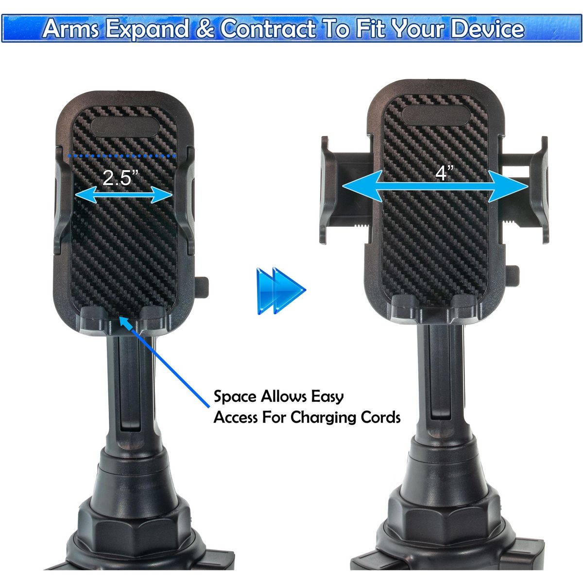 The diameter of the cup holder phone holder base is adjustable from 2.5" to 3.5", which will fit most car cup holders. Please measure the size of your car cup holder before purchase to make sure it will fit. Compatible with all cell phones and devices between 2.1"-4.0" width and within 0.6" thickness. No extra tools are required to install the cell phone holder for car cup holder. Assemble it in seconds simply put it in the car cup holder, twist the knob to fit, then you could put your phone in and enjoy your drive. To release or lock your cell phone on the car cup holder phone mount, just press the button on the back or squeeze the clip arms with one hand.
