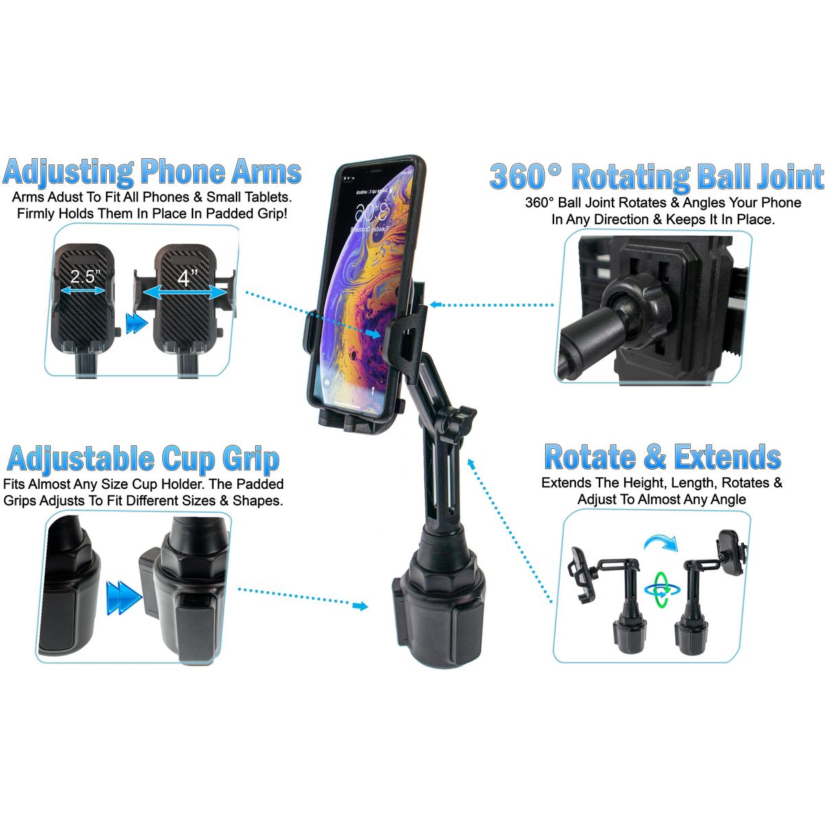 The Universal Expanding Car Cup Base - Adjustable & Secure Gooseneck & 360 Degree Rotating Cell Phone Holder