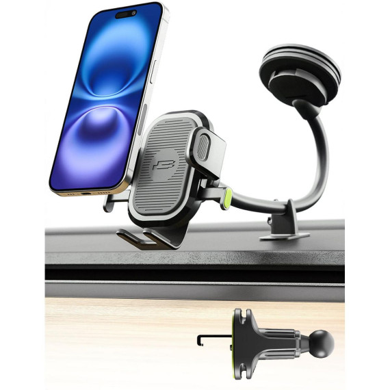 "The Bracketron OneClick 3-in-1 Flexible Phone Mount delivers secure, adaptable phone mounting designed for everyday driving. This versatile system allows installation on your dashboard, windshield, or air vent, giving you flexibility to match different vehicles and driving preferences.