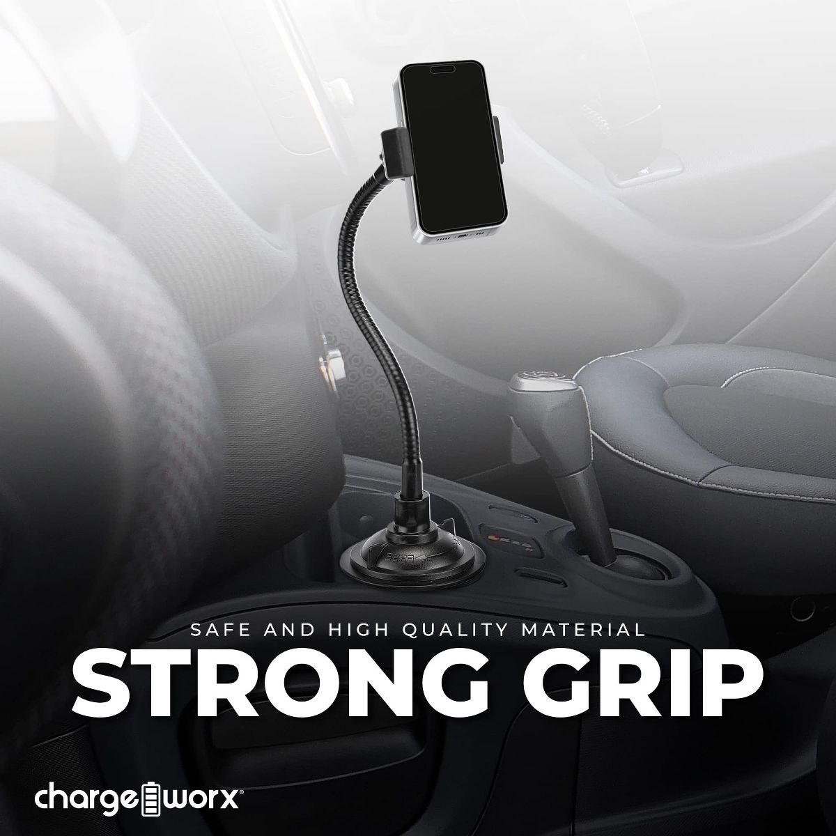 • Universal Compatibility and Versatile Design - The Chargeworx CX9707BK cup holder phone mount accommodates a wide range of smartphones, making it a versatile cell phone holder and car cup holder. The adjustable grip ensures compatibility with most phone models, while the cup phone holder's 360-degree rotation allows optimal viewing angles. With its unique phone mount design, the CX9707BK caters to various phone sizes and shapes, ensuring your device remains securely in place.
