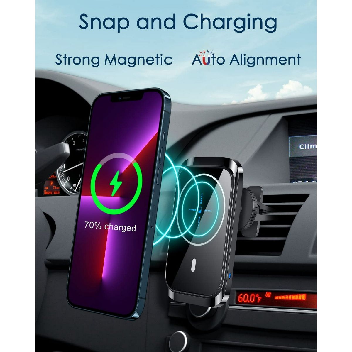 MagSafe-Compatible & Universal: Specially designed for MagSafe-compatible iPhones, it works with other wireless charging devices as well, as long as their cases align with the magnets. Just place your phone on the mount, and it’s ready to charge—no wires, no hassle.