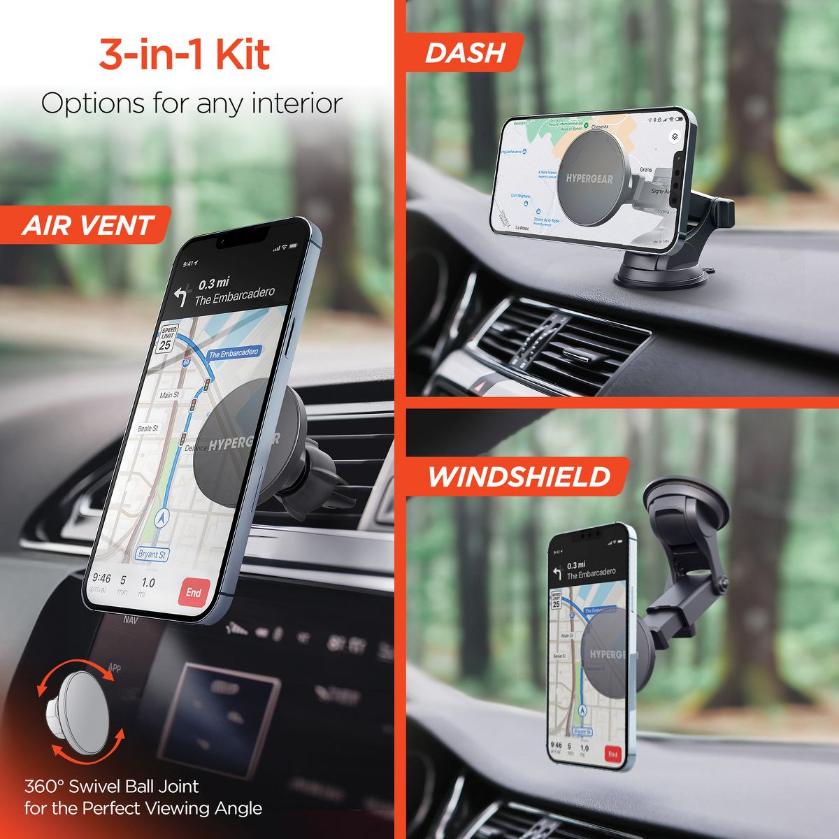 HyperGear® Mag Grip Phone Mount Kit with MagSafe® Vent, Dash, and Windshield Mounts, Black