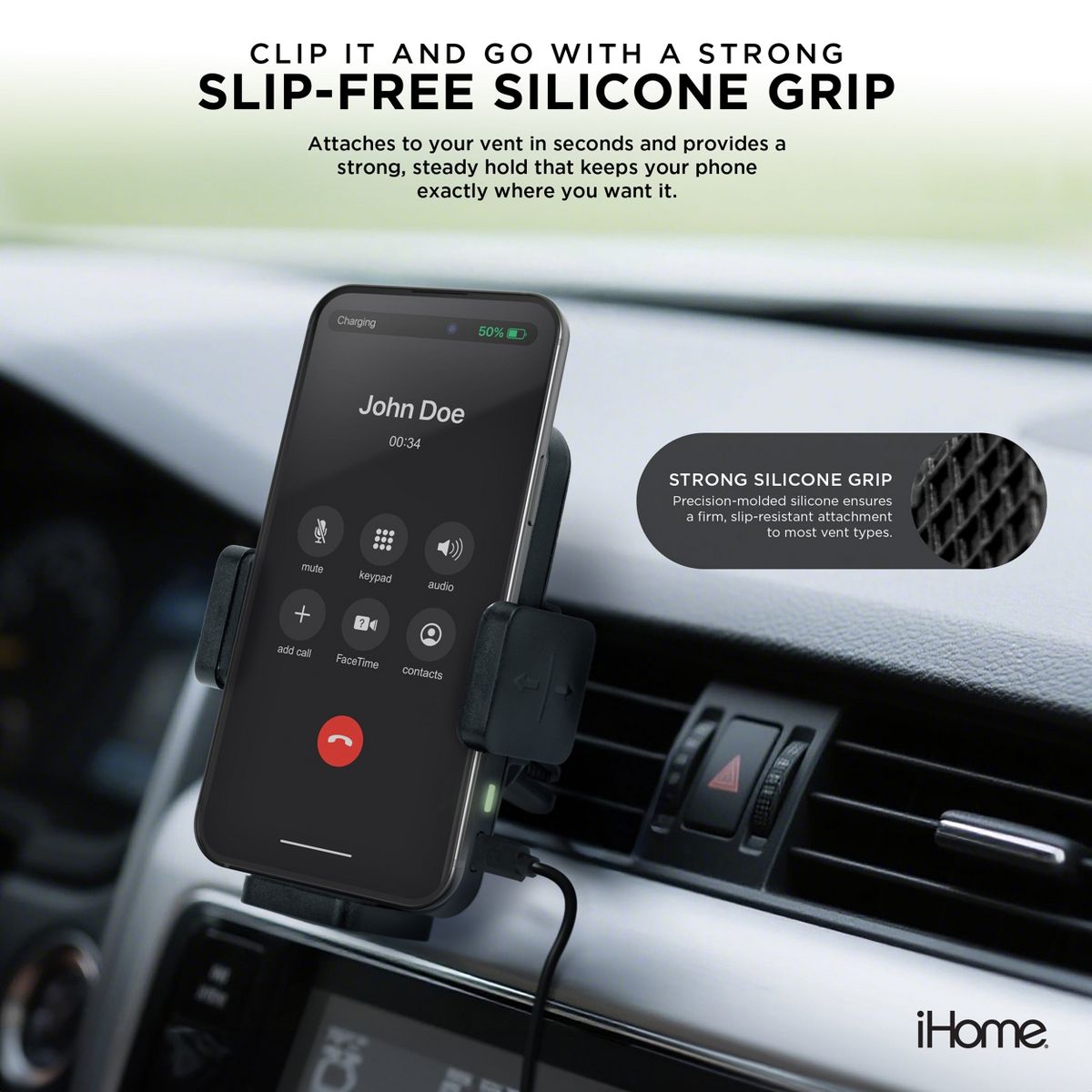 iHome 15W Wireless Car Charger Mount, MagSafe Compatible, Dashboard/Vent Mount with Swivel Neck, Silicone Grip, Overheat Protection, Universal