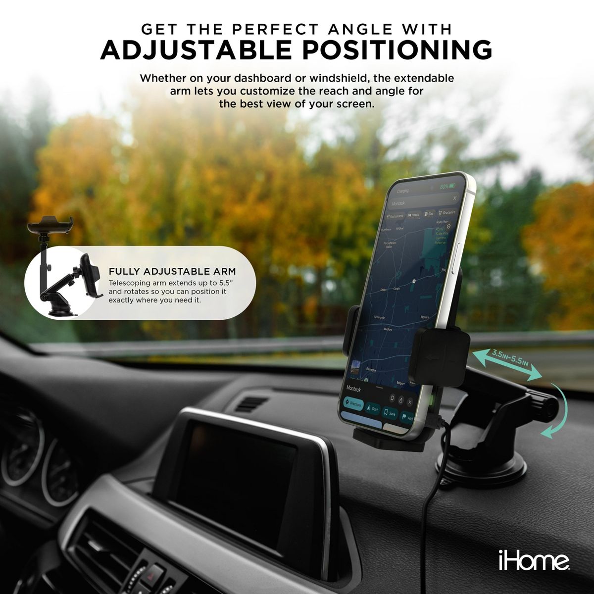 Designed with convenience in mind, this mount offers three installation options—mount it on your dashboard, windshield, or vent. With a strong suction cup base and silicone grip, your phone will stay secure through every bump and turn. Plus, the extendable telescoping arm lets you adjust the angle and extend the arm from 3.5” to 5.5” so you can find the perfect view.