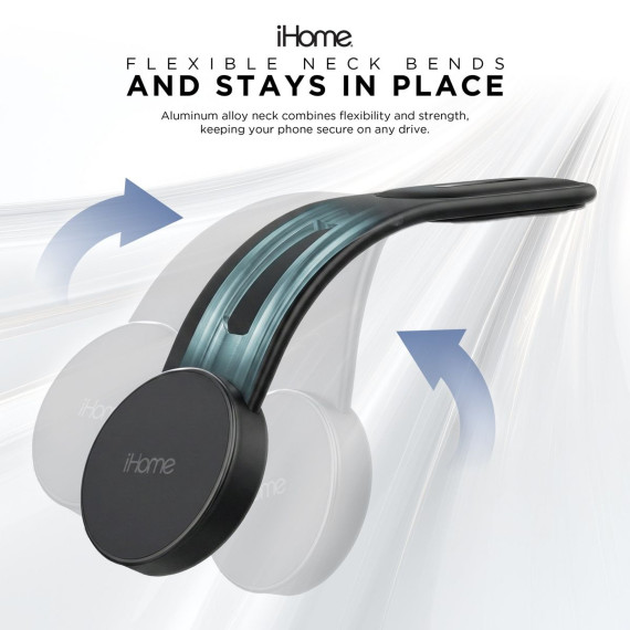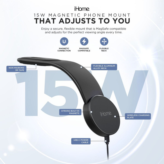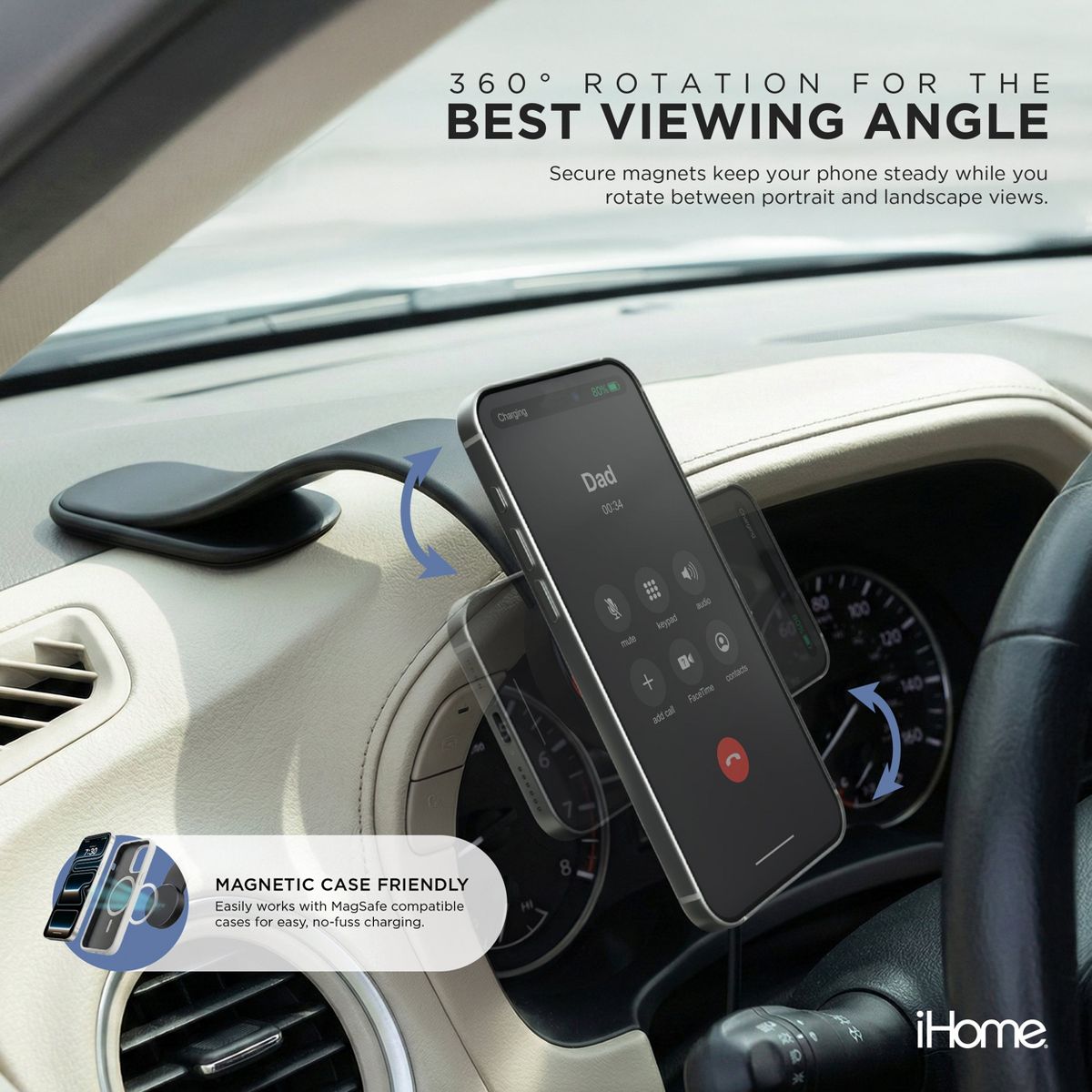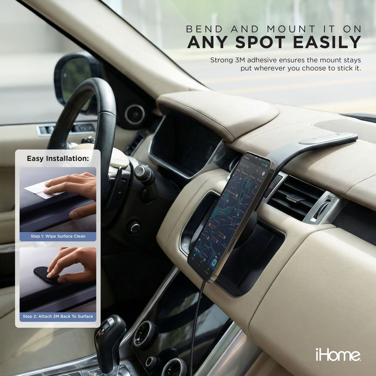 Power your drive with a phone mount that adapts to you. The iHome Magnetic Charging Flexible Dash Mount brings together wireless charging, secure magnetic hold, and flexible positioning to make every drive more comfortable and convenient. Thoughtfully designed for modern vehicles and busy lifestyles, it keeps your phone powered, visible, and within easy reach. With 15W wireless charging, your phone stays charged during long commutes, quick trips, and everything in between. Strong built-in magnets align perfectly with MagSafe-compatible phones and magnetic cases, helping deliver a consistent charge while keeping your device firmly in place—even when the road gets rough. Just set your phone on the mount and enjoy reliable power as you drive. The flexible neck is made from memory aluminum alloy metal, giving you the freedom to bend and adjust until your screen sits exactly where you want it. Mount it behind the steering wheel, above built-in navigation screens, on the windshield, or anywhere with a smooth surface. Whether your car setup changes or you just want a better angle, this mount moves with you. Installation is just as thoughtful. The non-marking 3M hook-and-loop fastener attaches securely to flat surfaces and removes cleanly when needed—no sticky residue, no damage left behind. Bring comfort, flexibility, and reliable charging to every mile with a dash mount designed to fit your drive.
