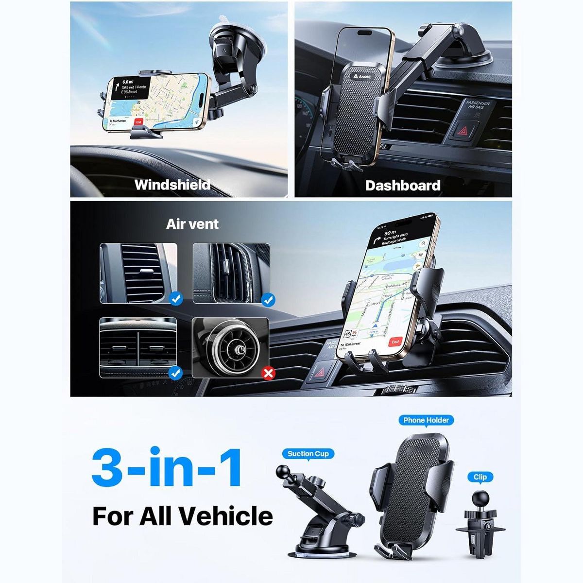 [3-In-1 Universal Phone Mount for Car] This car phone holder mount is mounted securely on the dashboard windshield or air vent. It can meet your different use needs as dashboard cell phone holder, suction cup phone holder or car vent phone mount. Engineered for Uber/Lyft drivers and daily commuters, Perfect for most cars, pickup trucks, SUVs, trucks, taxis, touring cars.
