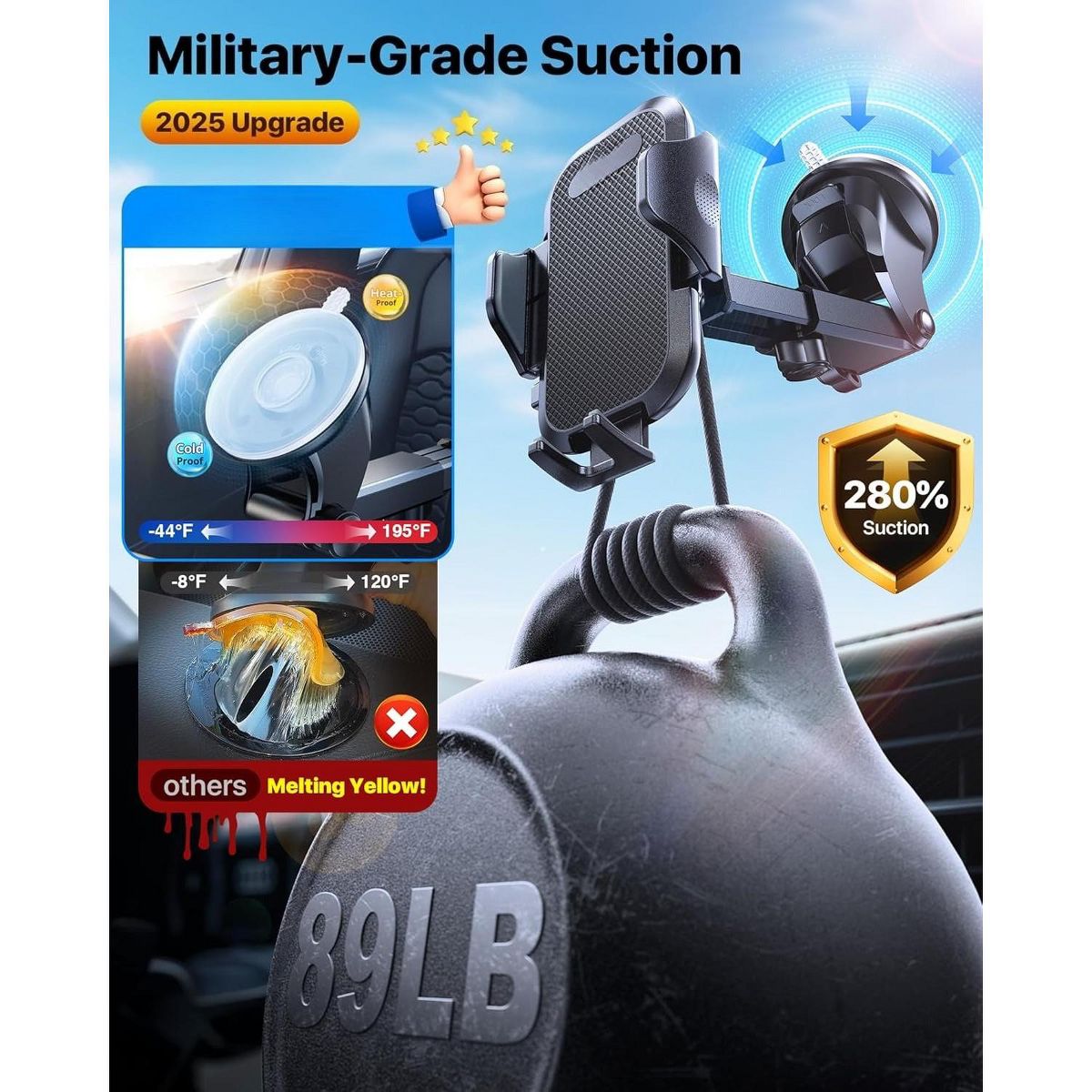 [Super Suction Cup|Never Drop, No Residue, Rough Road Friendly] Engineered with 2026-Upgraded Fluorosilicone + Nano-Adsorbent Technology, our cell phone car mount delivers 80% stronger suction than average car holders, securely gripping up to 89 LBS—even on bumpy roads or extreme climates (-40°F to 203°F)! Just rinse with water to restore the stickiness.
