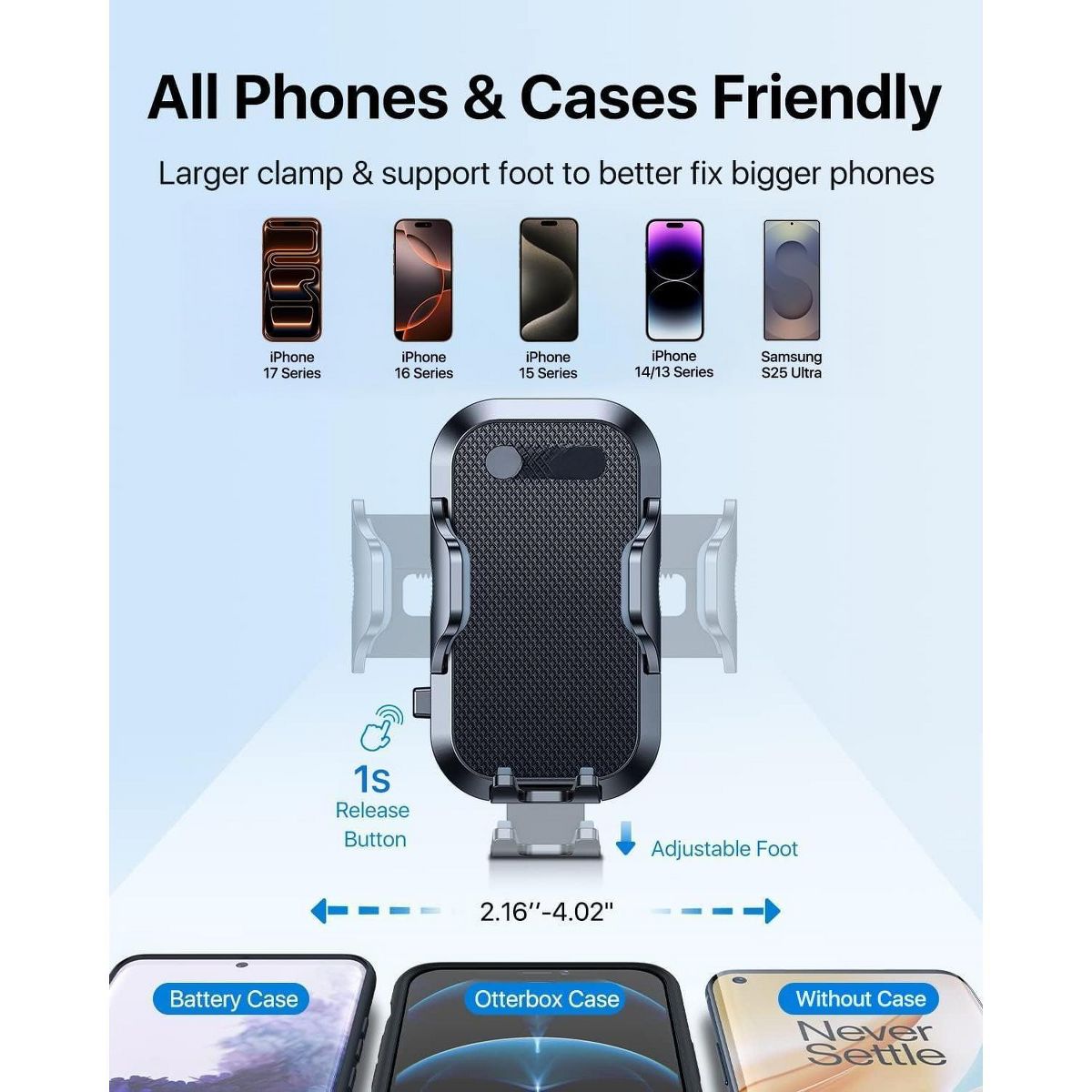 [Wide Compatibility, Big Phones & Thick Cases Friendly] Listening to 22,000+ customers' voices, we upgraded extra deeper and wider adjustable clip arm of this cell phone car mount to make it fits big phones and thick case. This cell phone holder car is compatible with all mobile phones between 4 and 7 inch, compatible with iPhone 17 Pro Max 16 15 14 13 12 11 XR X 8 7 SE mini Samsung Galaxy S25 Ultra S24 S23 S22 S21 A53 A22 Google Pixel Xiaomi Motorola, etc.