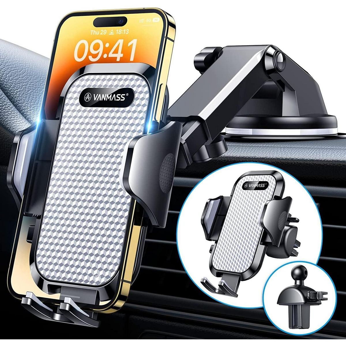 【- //】Equipped with a suction cup and a flexible air vent clip, our car phone mount firmly secures to your dashboard, windshield or air vents. Its 360-degree swivel head and 270-degree adjustable arm provide the perfect viewing angle, ensuring clear visibility while keeping your maps and directions readily accessible