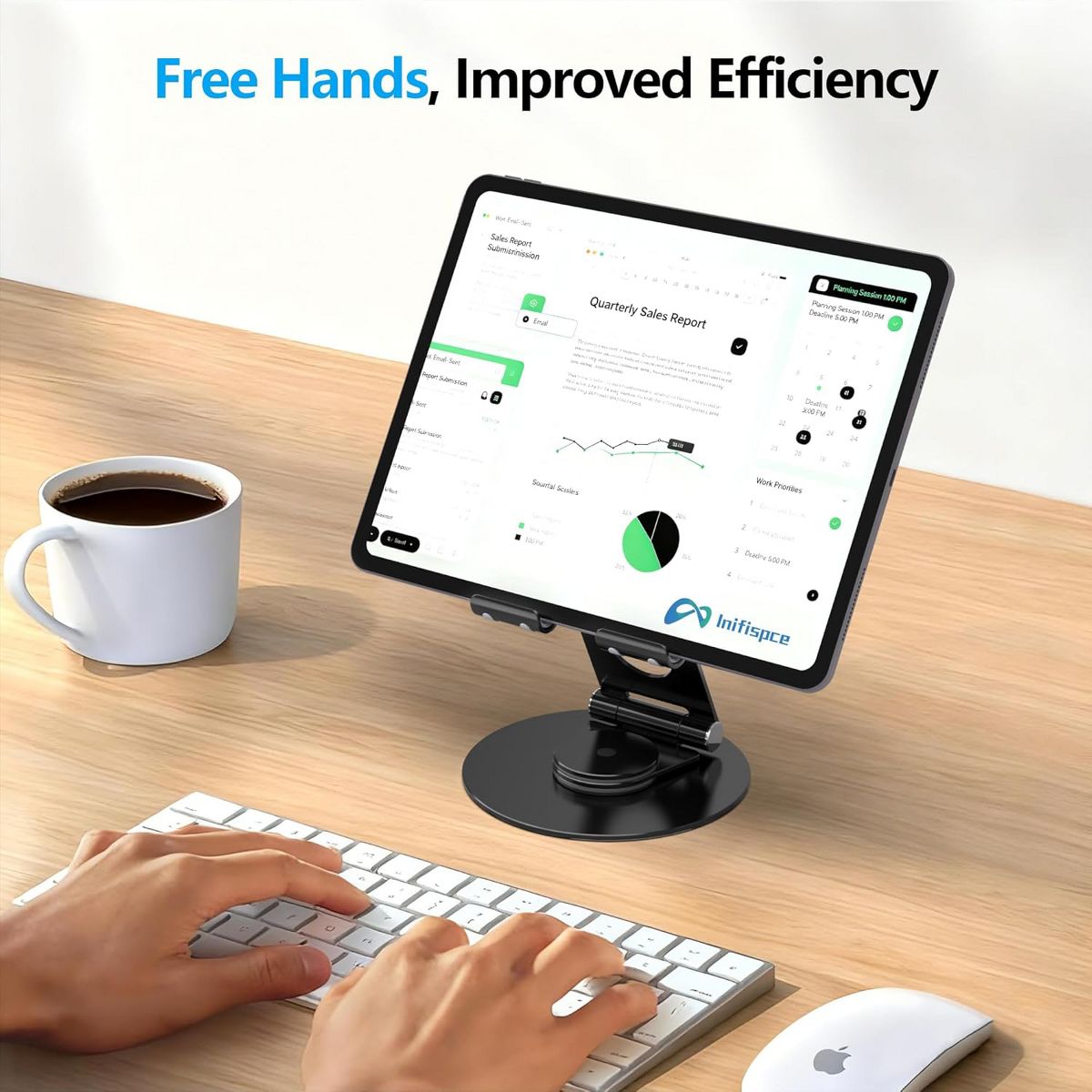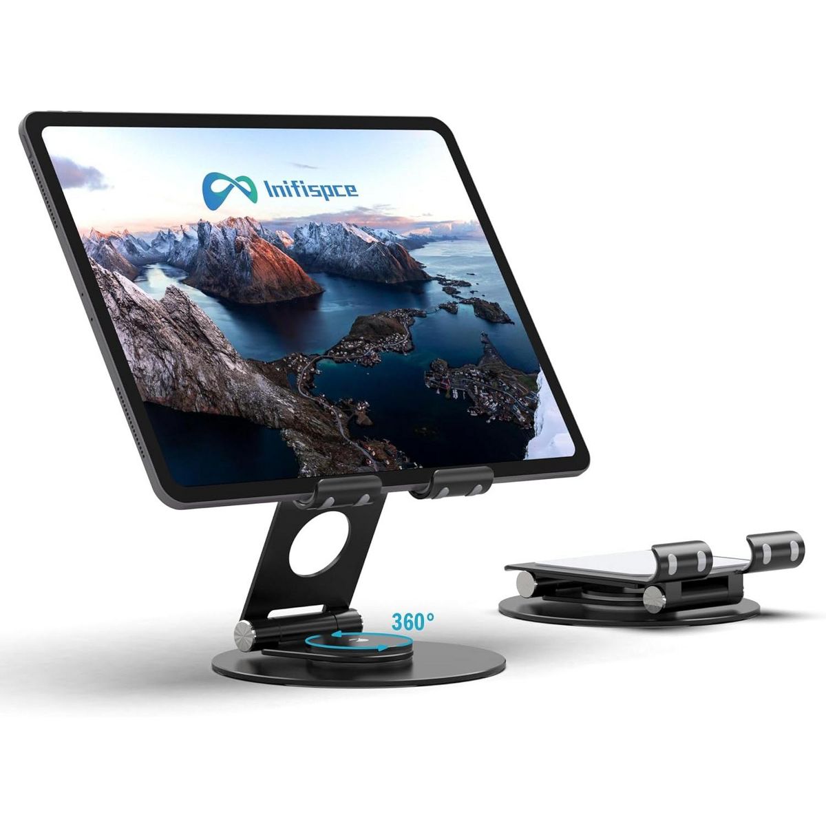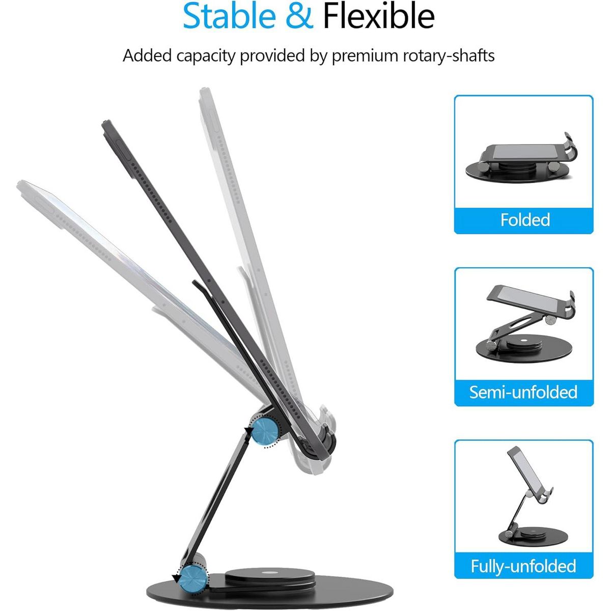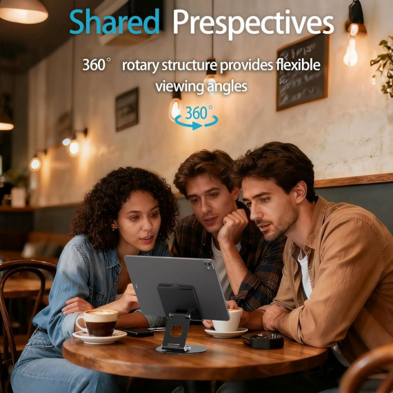 【360°Rotation】With a 360°rotating base, you can easily share your creation or business ideas with one-hand direction control. No need to move the traditional tablet stand back and forth like before