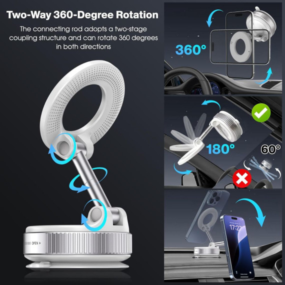 Wide Device Compatibility & Instant Setup: Supports iPhone 12–17 and other smartphones with the included magnetic ring. Mounts firmly to dashboards, mirrors, windows, or smooth tile—ideal for your car, home, or studio. Setup takes seconds. Do not use on armor, silicone, leather, suede, or uneven phone cases, as the magnetic ring may not adhere securely