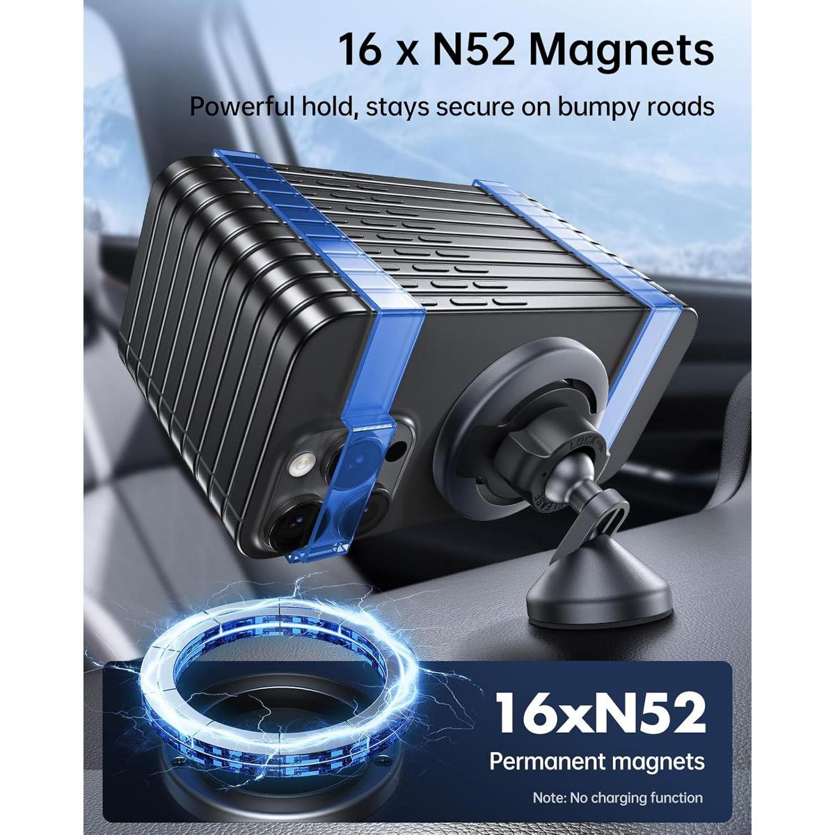 【Optimal Magnetic Balance】Equipped with N52-grade neodymium magnets, the MagSafe car phone mount provides an extremely strong magnetic hold, ensuring your phone stays securely attached, even on bumpy roads. Compatible with all MagSafe-enabled devices and MagSafe-compatible cases, it provides stability without compromising on ease of use. For non-magnetic case, just stick the metal ring provided outside the case. (NOTE: This car mount is designed solely for holding phones; no charging function.)