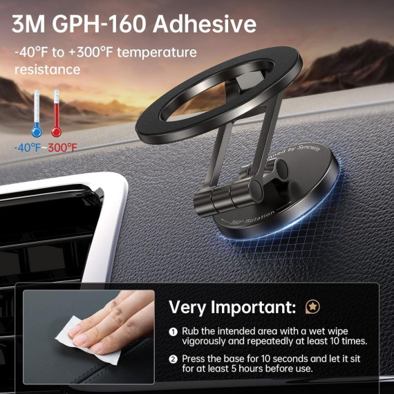 【Genuine 3M Adhesive】- It uses authentic 3M GPH-160 adhesive for enhanced stability. Even in extreme temperatures ranging from -40°F to +300°F, the magnetic car mount maintains adhesion, offering long-lasting stability, and includes spare adhesive pads for replacement. Press for 10 seconds and wait for 5 hours to strengthen adhesion. (IMPORTANT NOTICE: 3M adhesive tape is not suitable for application on interior surfaces like genuine leather, suede, and oil-coated fabrics. Avoid using it on these surfaces to prevent damage or poor adhesion.)