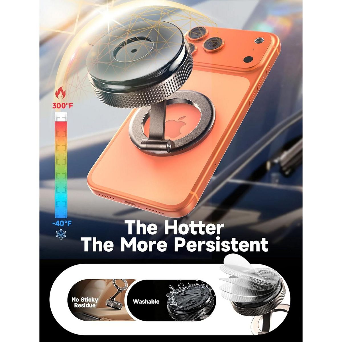 Double Locking, Vacuum Adhesion: This magnetic phone holder for car redefines the standard of sturdiness for car accessories. Its core advantage lies in its 'double locking' mechanism: a powerful vacuum pressure is generated by a one-button rotation, supporting up to 105 pounds; secondly, the TPU heat-sensitive suction cups 'actively tighten' like muscles when faced with drastic temperature changes, increasing the suction force instead of decreasing it and holds firm in extreme temperatures (-40°F to 300°F). Unlike adhesive holders, this iphone car mount can be effortlessly removed and repositioned without leaving any residue