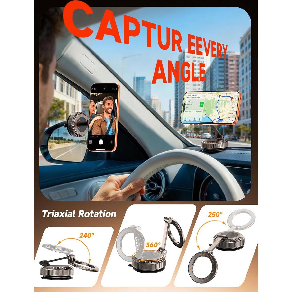 Three-axis multi-adjustment: The adjustable car mount for iphone supports 360° horizontal rotation and 270° forward and backward tilt, allowing for instant switching between portrait and landscape views. No matter where you place your magnetic car phone holder, the screen will remain perfectly aligned with your line of sight. Say goodbye to awkward angles and distracting adjustments, comfort with every use