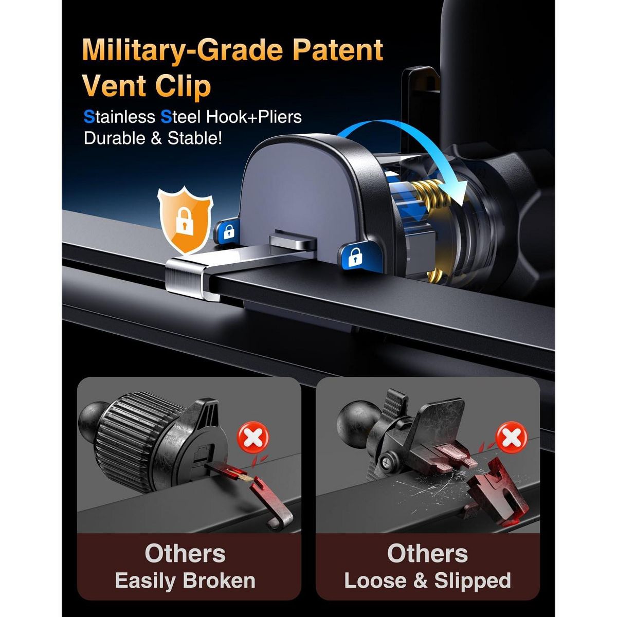 【 - 】Engineered from premium German PC2805 material, car vent clip offers exceptional durability and stability, far surpassing standard ABS plastic. Its Three-point fixation design securely grips your car's air outlet blades, keeping your phone stable on bumpy roads. With an upgraded hook length of 1.37 inches, it fits 99% of vertical and horizontal vents. The soft silicone pad on the clips back protects your vent blades from scratches and damage