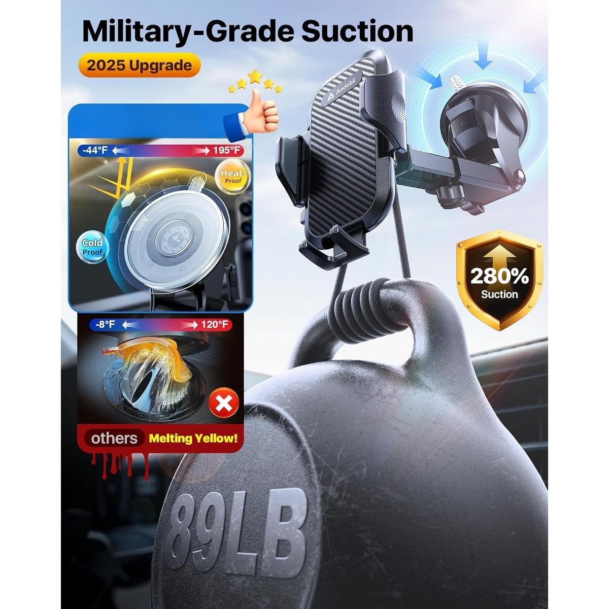 【Upgrade Suction Cup, Strongest Suction】 Engineered with upgraded three-layer nano-gel suction cups, this mount creates a powerful double-lock vacuum that delivers up to 85 pounds of suction force. It grips tightly, providing stability even on rough and bumpy roads.The suction cup is easy to remove and can be washed clean and reused.