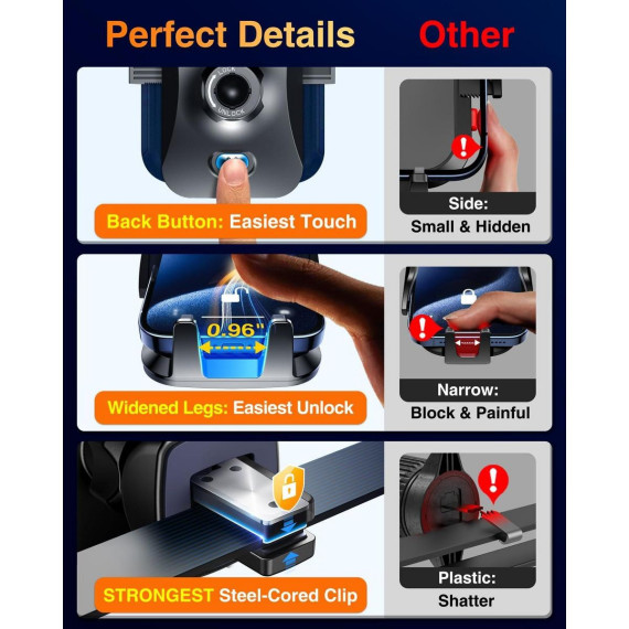 【 】①Original Lower-Back Release Button with Location Points: Won’t excessively bend fingers as side button, Most Comfortable for Any Finger, esp with big phones ②Original Thickened Fixed Cradle Legs: Upgraded from flimsy drop-down bottom legs, Safely Support Any Weight Phone on the Bumpy Road ③Original 0.96” Width Widened Cradle Legs: 1.6X Wider than others.
