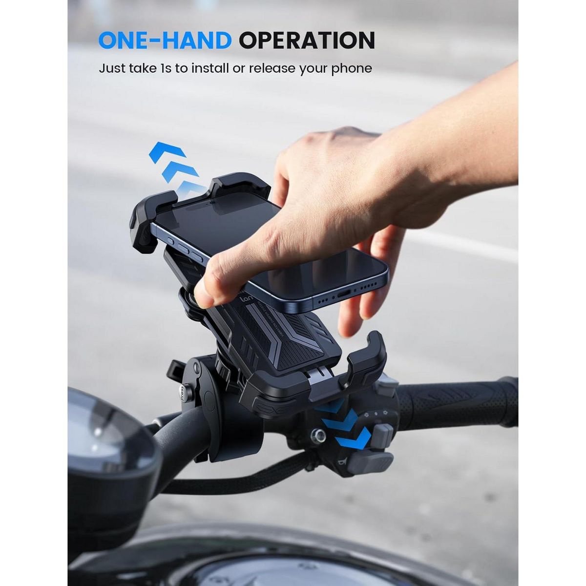 【 One Hand Operation】 This phone mount for adopts upgraded handlebar clamp and security lock. Enjoy the fast installation and it only takes 1s to lock the phone. Easy to install your smartphone with one hand and also quick release.