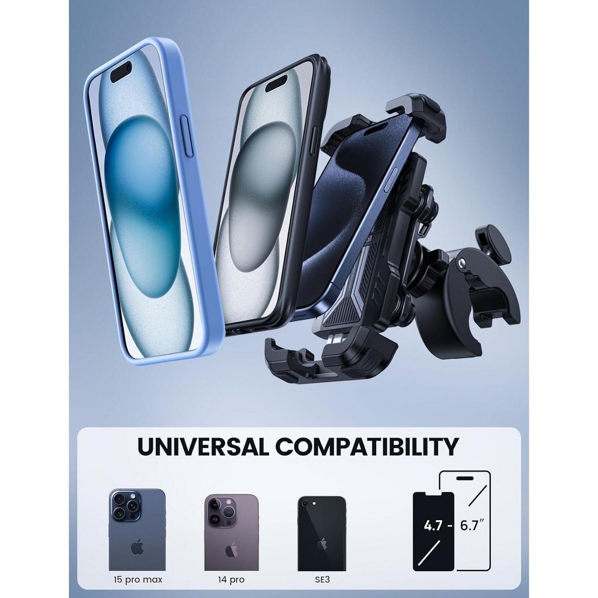 【 Wide Compatibility】 This universal bike phone mount can fits 4.7 - 6.7” phones, like iPhone 17/ 16/ 15/ 14/ 13 Pro Max, iPhone Air, iPhone 16/ 15/ 14 Plus, iPhone Xs, Xs Max, more. The max thickness that the phone clip can hold is 0.59". The handlebar clip is suitable for handlebar with diameter of 0.59 - 1.57" (15-40mm). Not compatible with Galaxy S23 Ultra, S24 Ultra. The max height/ width of the phone clamp is 6.54" (166mm)/ 3.11" (79mm).