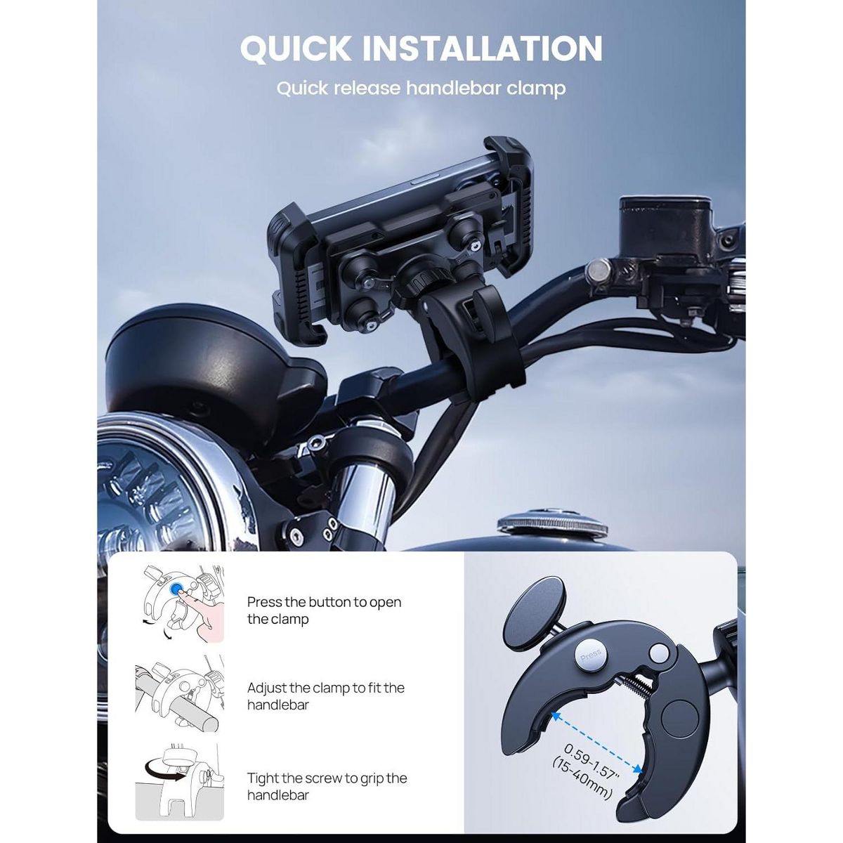 【 One Hand Operation】 This phone mount for adopts upgraded handlebar clamp and security lock. Enjoy the fast installation and it only takes 1s to lock the phone. Easy to install your smartphone with one hand and also quick release.