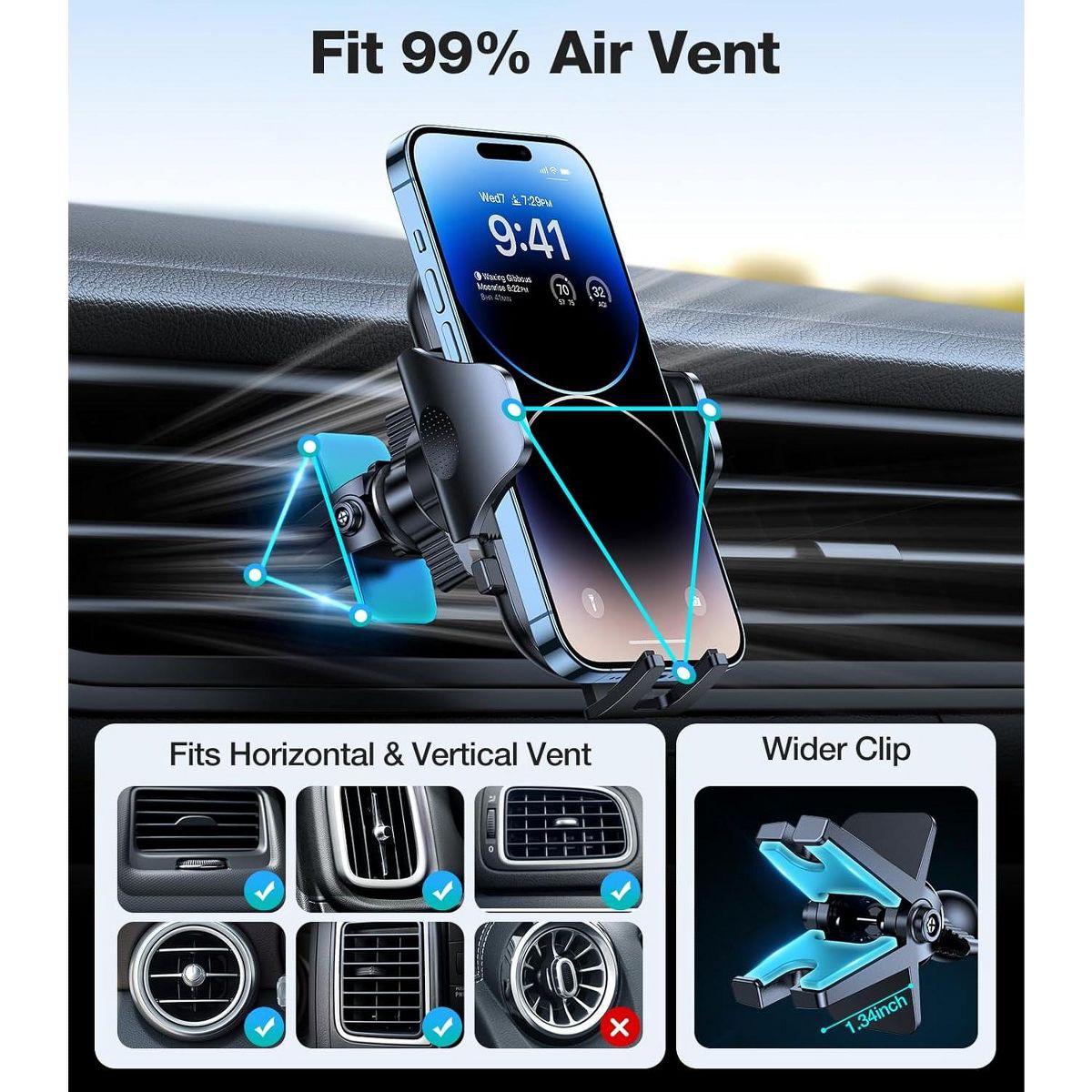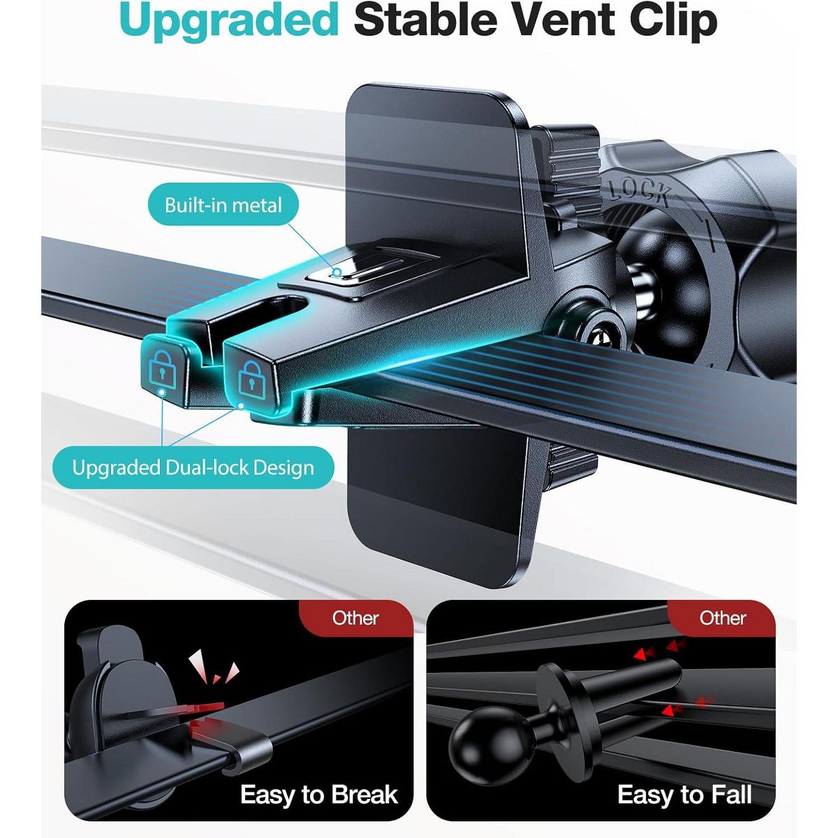【 Double lock Metal Vent Clip-Never Drop&Never Break】 : This car vent phone mount is made of air vent clip with 3 times wider contact surface and non-slip silicone, which not only improves the stability by 300% compared with single hook holder, but also disperses the pressure of the blades and protects your air vents . Built-in metal, never break. Whether it's a sharp turn or bumpy road, the iPhone car mount will not fall off
