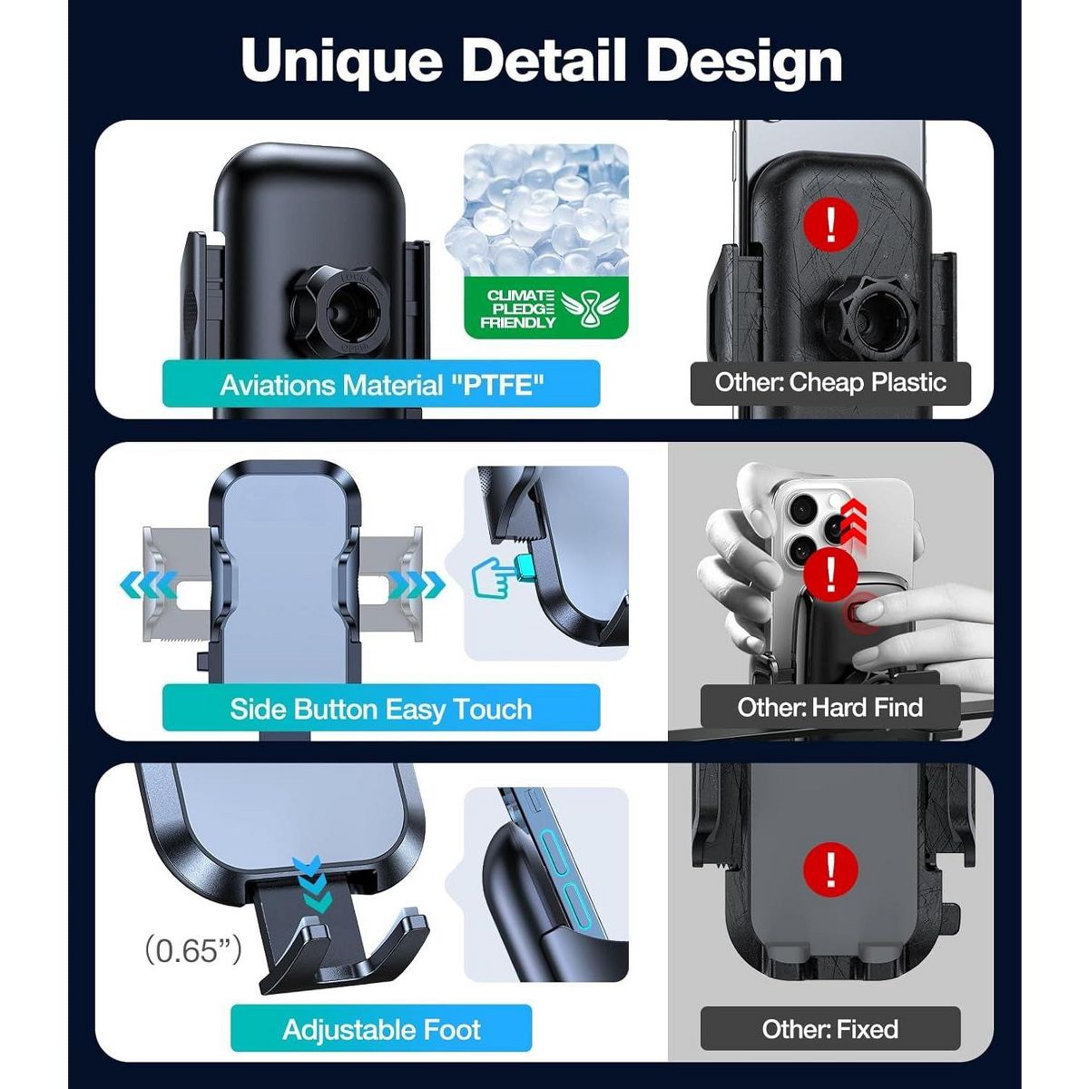 【Excellent Design】: This phone holder for car adopts an oversized side button design, which solves the problem that the buttons on the back of traditional car cellphone holders are difficult to find. The panel of the hands free phone mount for car is wrapped with unique thickened silicone, which completely solves the problem that traditional hard plastic phone car cell phone mount holders are easy to scratch and noisy