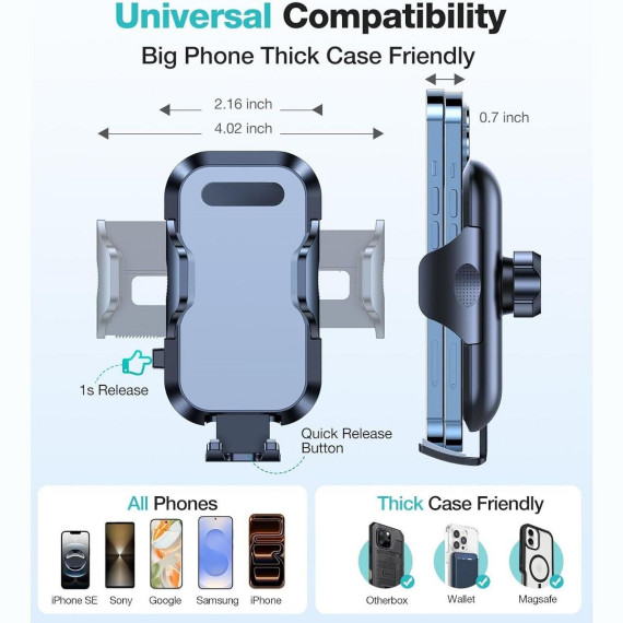 【Universal Compatibility】: This car phone mount fits horizontal/vertical/square air vent (99.9% of car models). Equipped with extra-wide adjustable arms, it is suitable for all smartphones (4.0-7.2 inches), and can hold even the thickest phone cases (such as otterbox cases) firmly. Designed for iPhone, Android, Samsung and other smartphones.