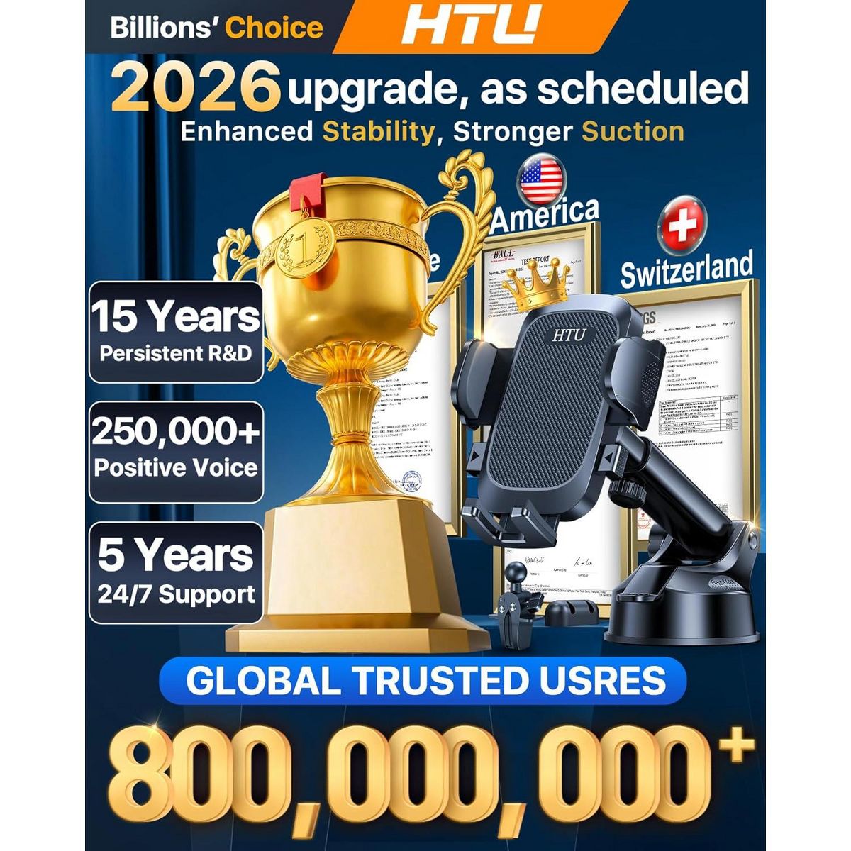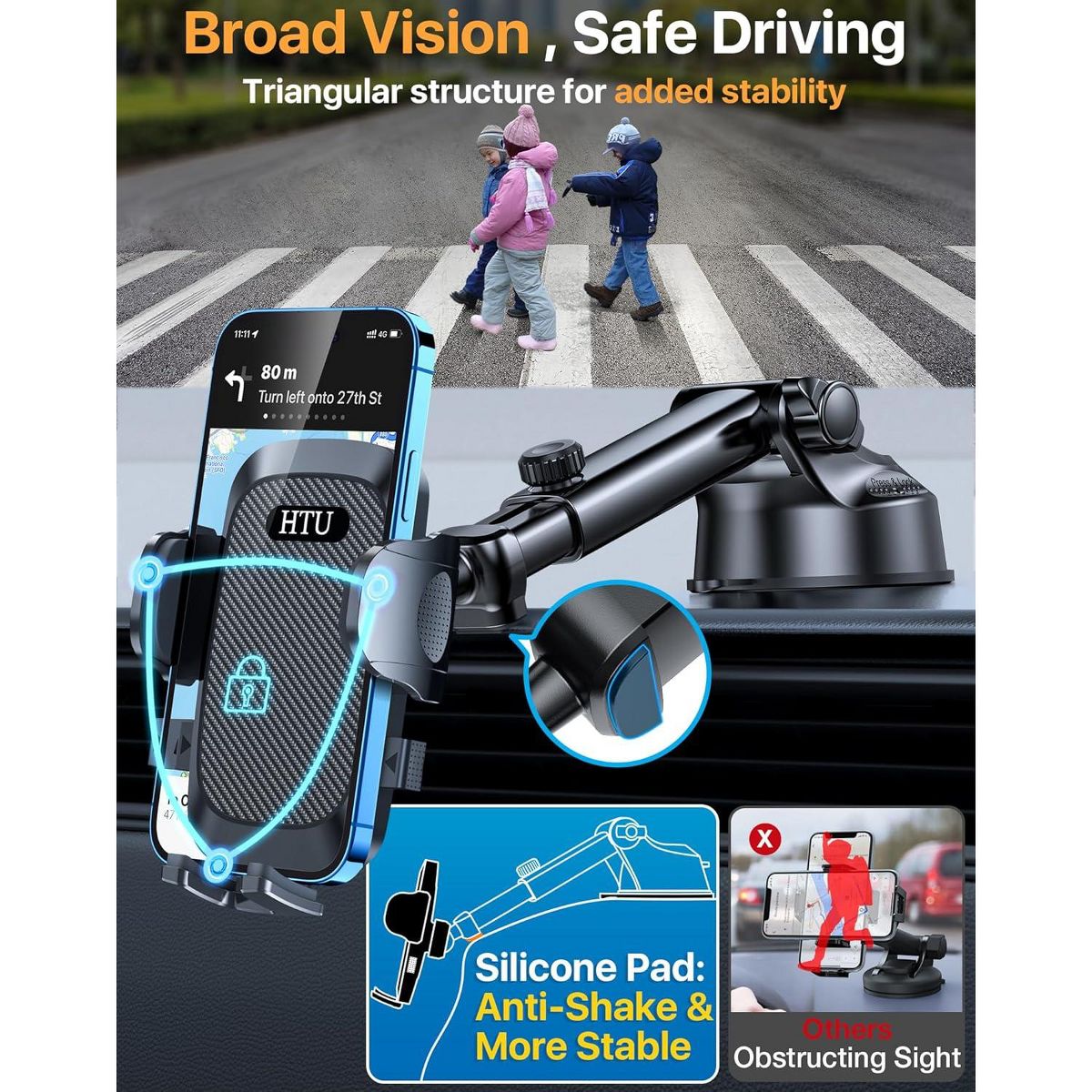 [MILITARY GRADE STURDINESS]: Our phone mount for car, also serving as a cell phone holder car, is the version ever based on feedback from over 8,000,000 customers. With the strong clamping force up to 80 lbs, it is 20 times sturdier than normal phone holders for your car. The extra strong suction cup with super sticky gel pad sticks tightly on your dashboard or most flat surfaces, making it the perfect phone holder for car.
