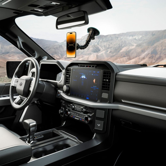 The ToughTested® Python Wireless Charging MagTough Glass Mount is an innovative device that offers 15 watts of wireless charging power. This product features a strong and adjustable gooseneck which allows users to position their devices at the ideal angle. Its base is designed to fit most cup-holders, making it convenient for use in cars. Additionally, the mount comes with 2 strong metal mounting rings that ensure a secure fit, along with a USB-C® to USB-C® cable for easy connectivity. Overall, this wireless charger combines functionality and flexibility, making it a great choice for those who need to charge their devices on the go._