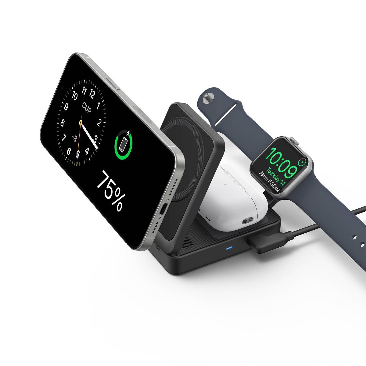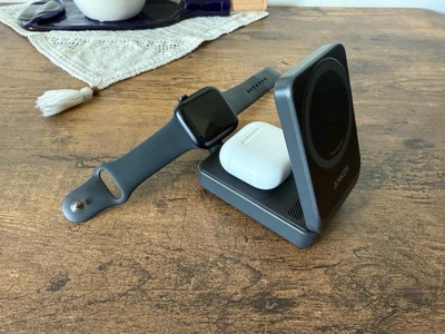 The Anker MagGo Wireless Charging station allows me to charge all 3 of my devices in one compact stand. I was able to shelve my apple watch charger and 2 apple charging cords just with this one product. Additionally, it is super compact which makes traveling with it a breeze.