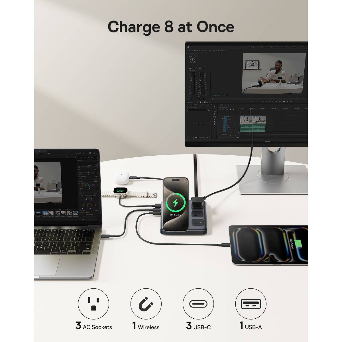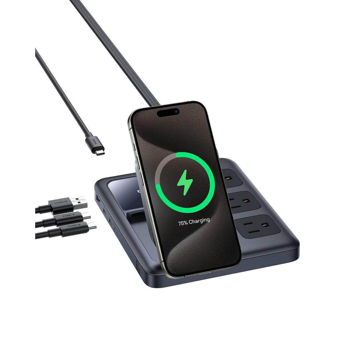 This charging station is very convenient, compact and durable. It includes 3 power outlets, 3 USB charging ports, and magnetic charging for both phones and smartwatches. The magnetic charger charges the phone quite quickly—faster than other types of charging cables. I can easily take this durable charging station on trips without worrying about not having enough outlets to charge my devices, such as phones, smartwatches, iPads, laptops, and more. Highly recommended!