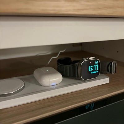 The Belkin WIZ016 (also known as BOOST↑CHARGE PRO 3-in-1 MagSafe Charging Pad) is a compact, travel-friendly charger for Apple devices, featuring MagSafe for fast iPhone charging (up to 15W), magnetic alignment, and a dedicated fast-charge module for Apple Watch Series 7, plus an AirPods charging spot with an LED indicator, all powered by a 40W adapter for simultaneous charging of your iPhone, Watch, and AirPods with a sleek, lay-flat design.